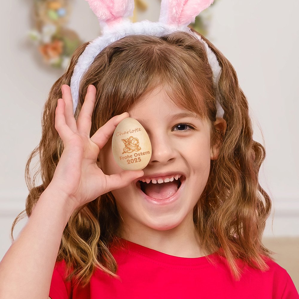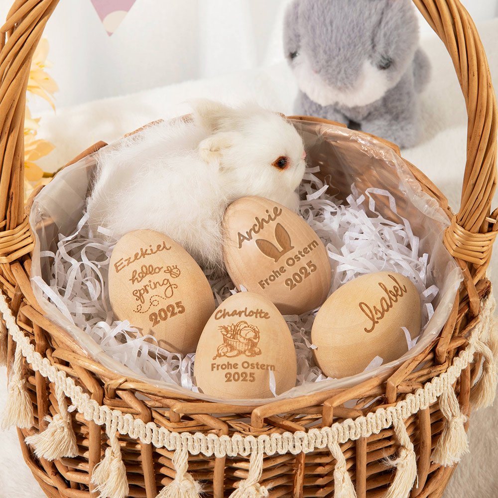 Dieses Holzei ist in vier verschiedenen Designs erhältlich, wie z.B. Hasenohren, Bienen und Obstkorbmuster. Namen und Text können eingraviert werden, um jedes Holzei einzigartig zu machen. Die glatte Oberfläche und die eleganten Schriftarten machen diese Osterdekoration traditionell und modern. Egal, ob es sich um den Namen eines Kindes, Urlaubswünsche oder ein besonderes Jahr handelt, Sie können es hinzufügen, um ihm einen persönlichen Charme zu verleihen.