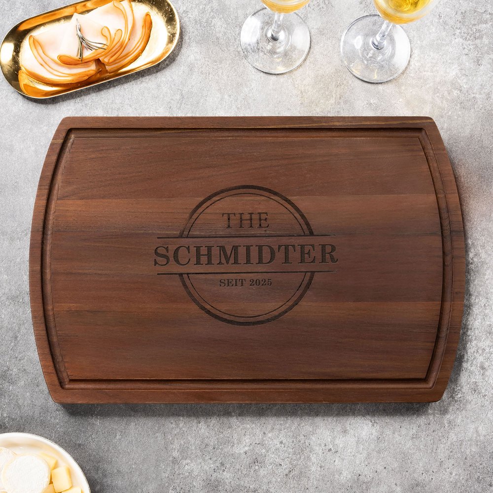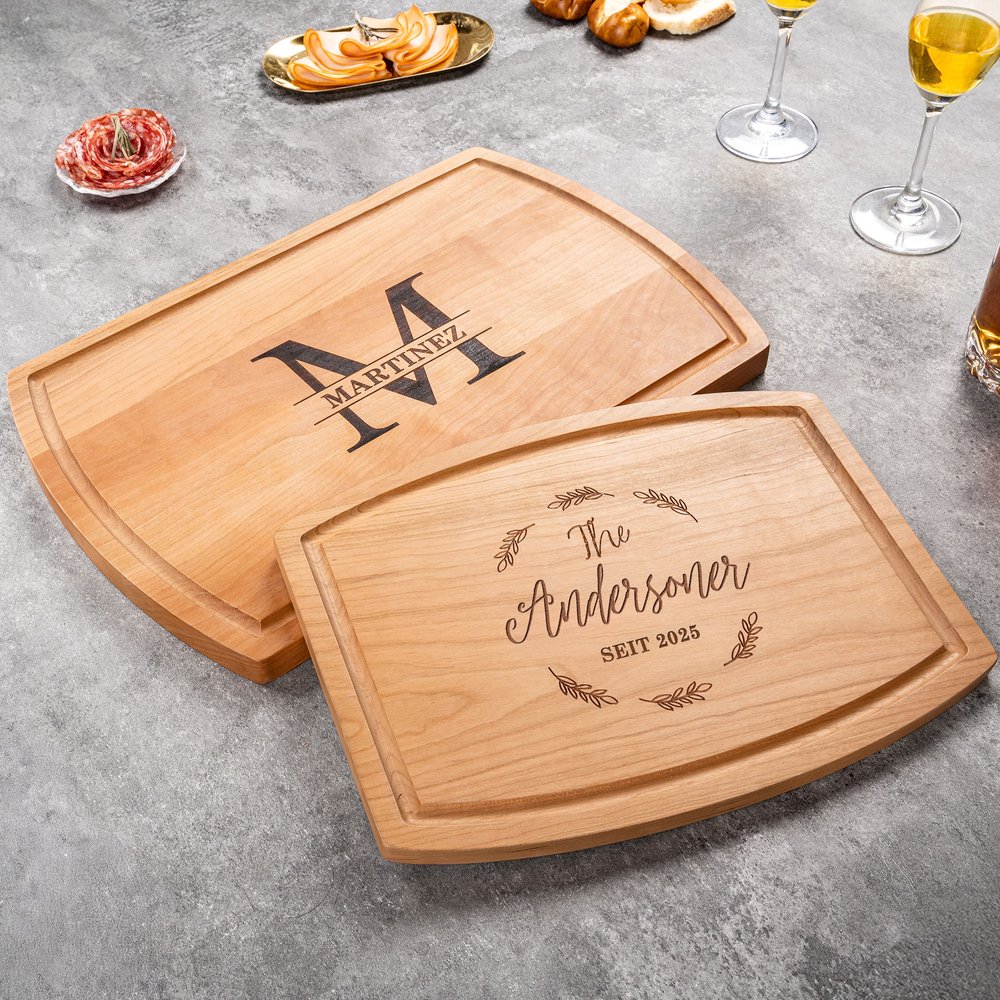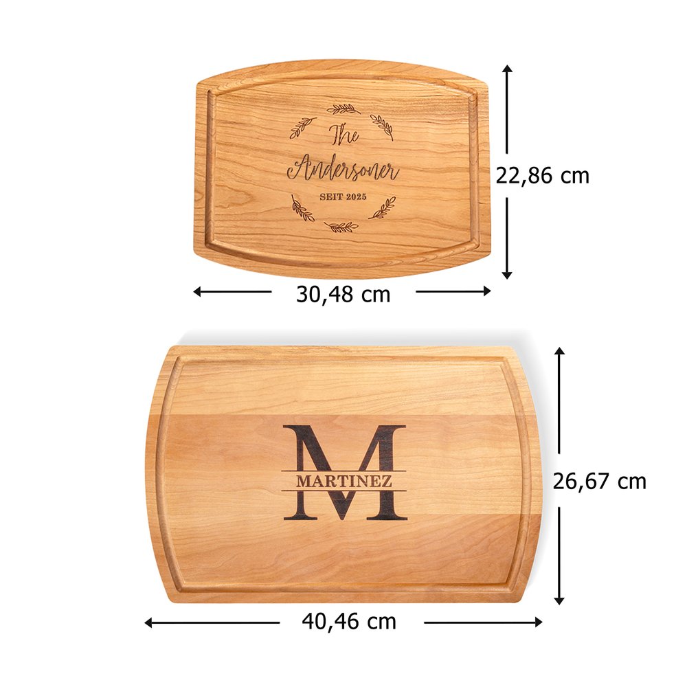 Entdecken Sie neun exklusive Designs, darunter Kranz- und Monogrammvarianten, die Sie ganz individuell mit Ihrem Familiennamen, einem besonderen Datum oder einer persönlichen Botschaft gestalten können. Die präzise Lasergravur verleiht dem Schneidebrett eine hochwertige Note und betont seine elegante Erscheinung.