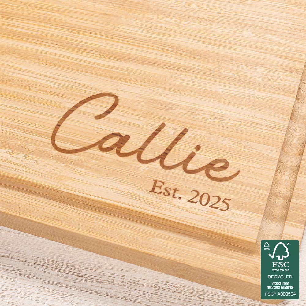 Dieses Schneidebrett ist in vier Ausführungen erhältlich. Sie können es mit Ihrem Namen, dem Datum oder den Initialen Ihres Partners gestalten. Das elegante und schlichte Blattdesign ermöglicht es Ihnen, Ihr persönliches Schneidebrett zu gestalten. Der exquisit eingravierte Text verleiht dem Brett Schönheit und eine perfekte Struktur.
