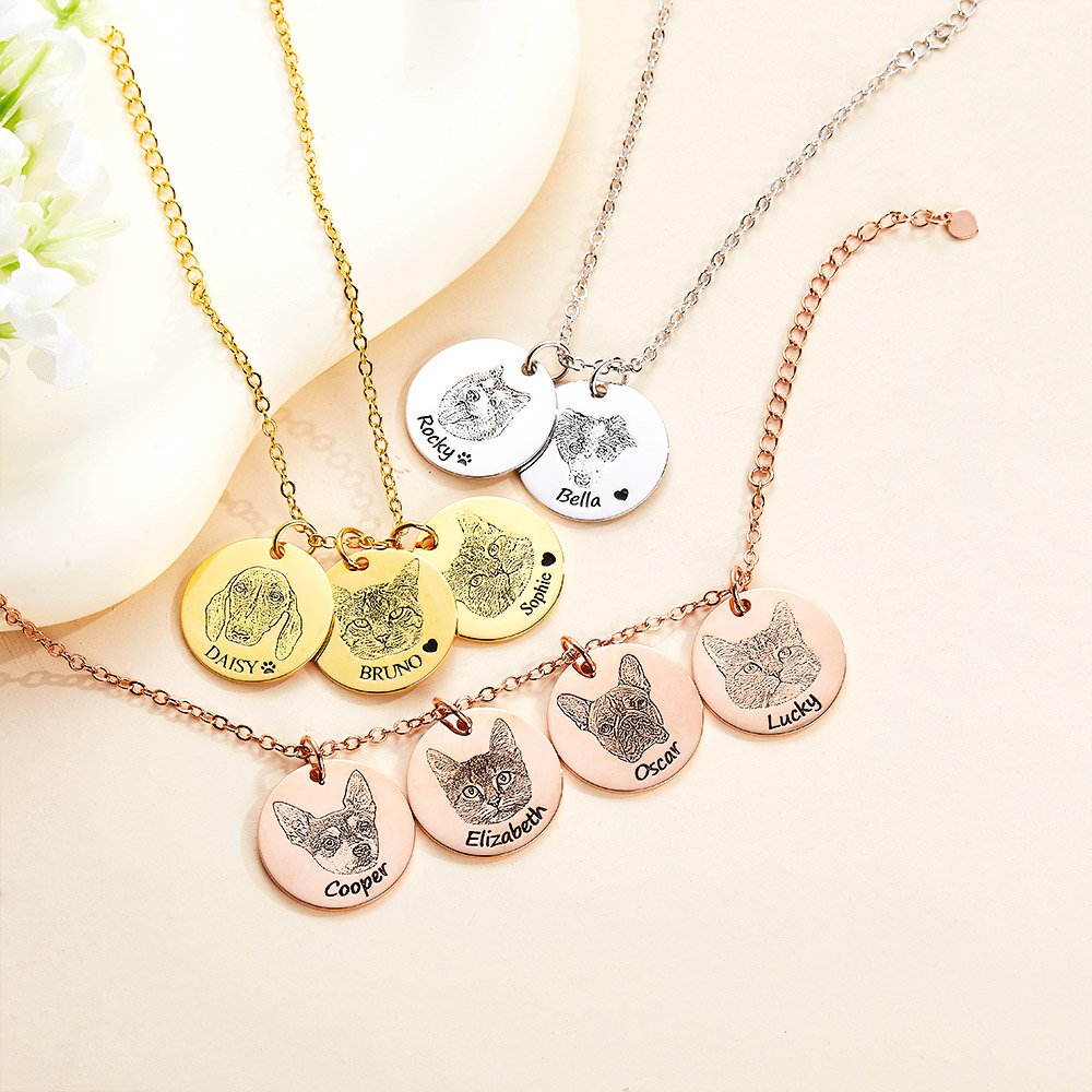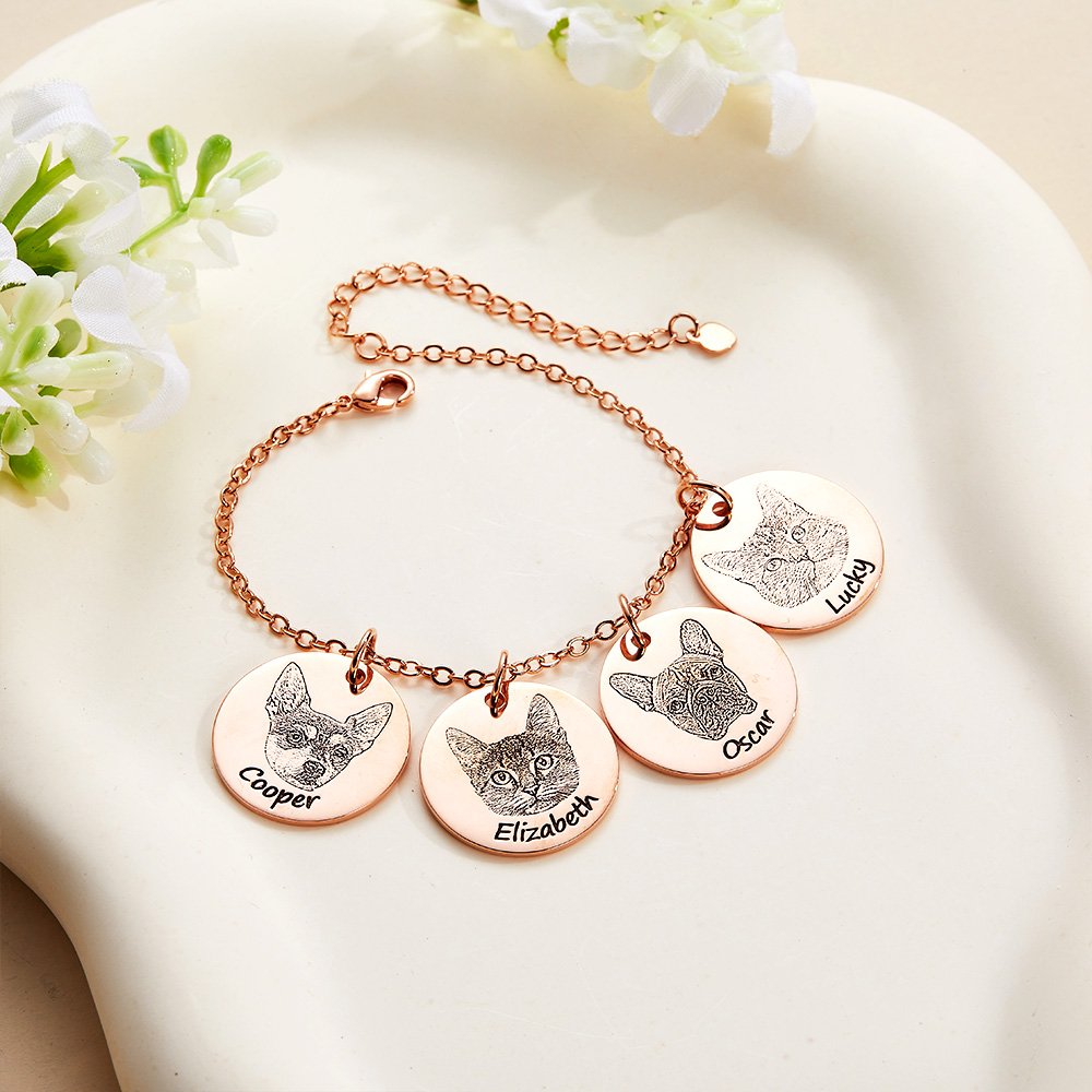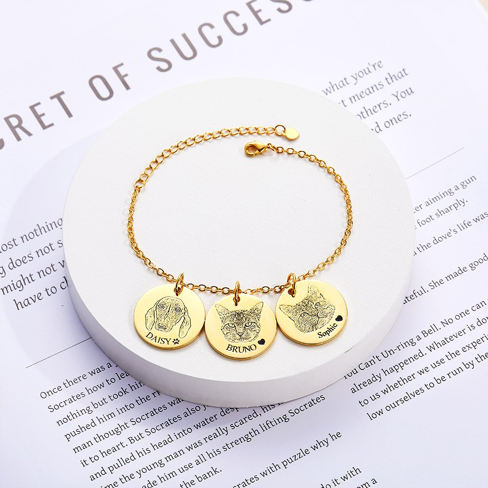Dieses Armband kann mit 1 bis 5 Scheiben Anhängern individuell gestaltet werden, je nach der Anzahl Ihrer geliebten Haustiere. Jeder Anhänger kann mit dem Porträt, dem Namen und einem niedlichen Symbol eines anderen Tieres graviert werden, um ein schönes und sentimentales Geschenk für Ihre Fell-Familie zu schaffen. Egal, ob Sie nur einen geliebten Gefährten oder ein ganzes Rudel haben, dieses Armband kann sie alle beherbergen und ist somit das perfekte Geschenk für Tierliebhaber mit mehreren Haustieren.