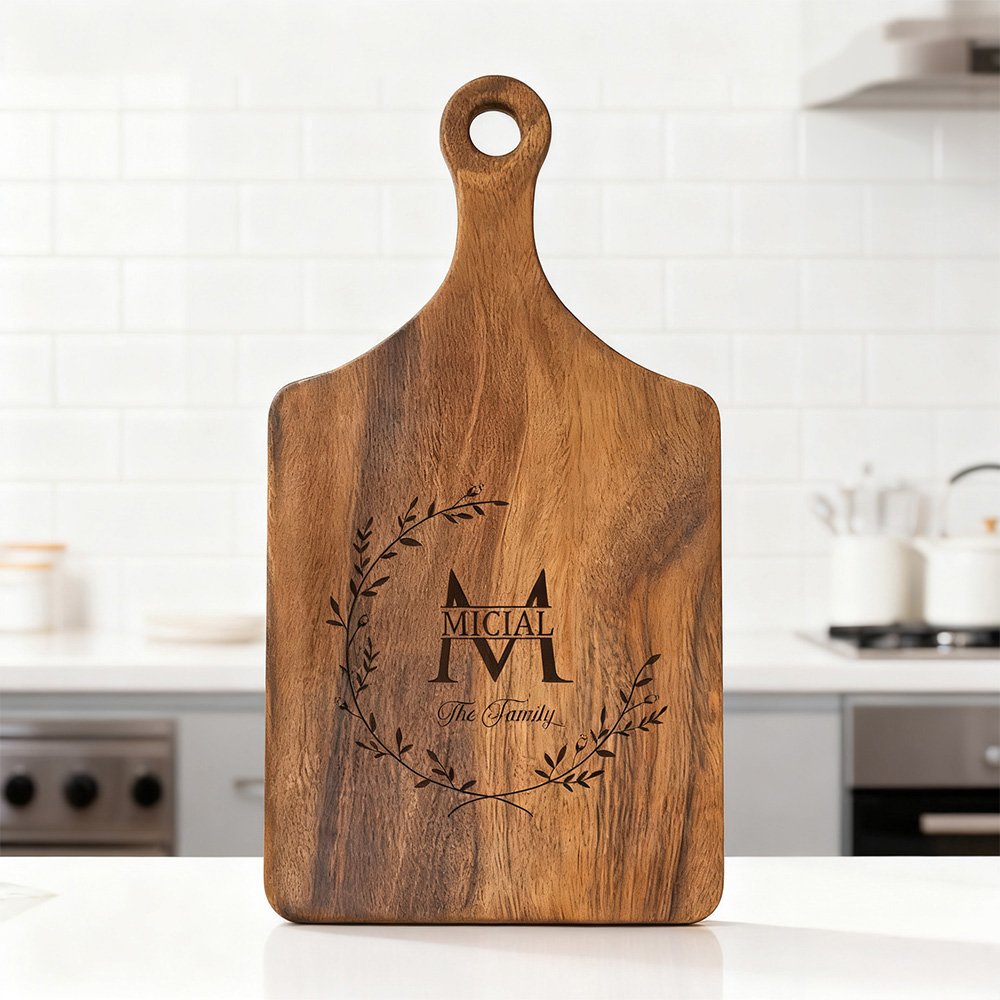 Die Kombination aus moderner Ästhetik und Holzmaserung verleiht diesem Schneidebrett einen einzigartigen künstlerischen Charme. Es ist mit exquisiten Kranzmustern verziert, mit einer individuellen Initiale und einem Familiennamen, die die Persönlichkeit jeder Familie oder jedes Paares hervorheben.