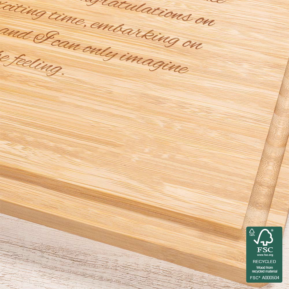 Dieses Schneidebrett verfügt über ein wunderschön graviertes Design, in das Sie einen Text einfügen können. Die Gravur ist präzise ausgeführt und verleiht dem Brett eine persönliche Note, die es einzigartig macht. Egal, ob es sich um eine herzliche Nachricht, ein Familienrezept oder eine einfache Notiz handelt, der eingravierte Text verleiht dem Brett ein einzigartiges und bedeutungsvolles Element.