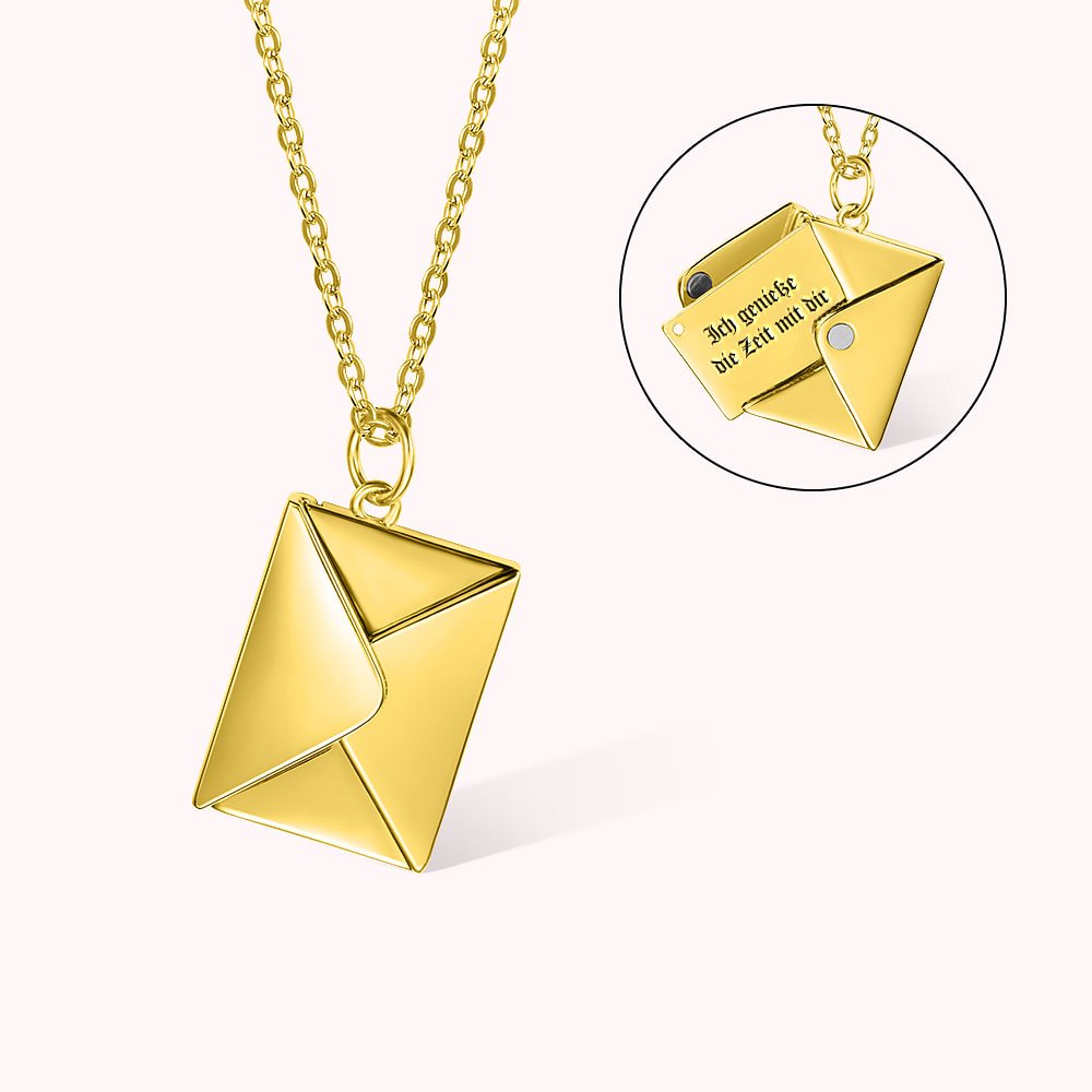 Diese einzigartige Umschlag-Halskette ist dafür entworfen, ein persönliches Foto oder eine gravierte, herzliche Botschaft zu bewahren, was sie zu einer wunderschönen Möglichkeit macht, Ihre Liebe auszudrücken. Es ist ein bleibendes Andenken, das Ihre Liebste stets nah an ihrem Herzen tragen kann.