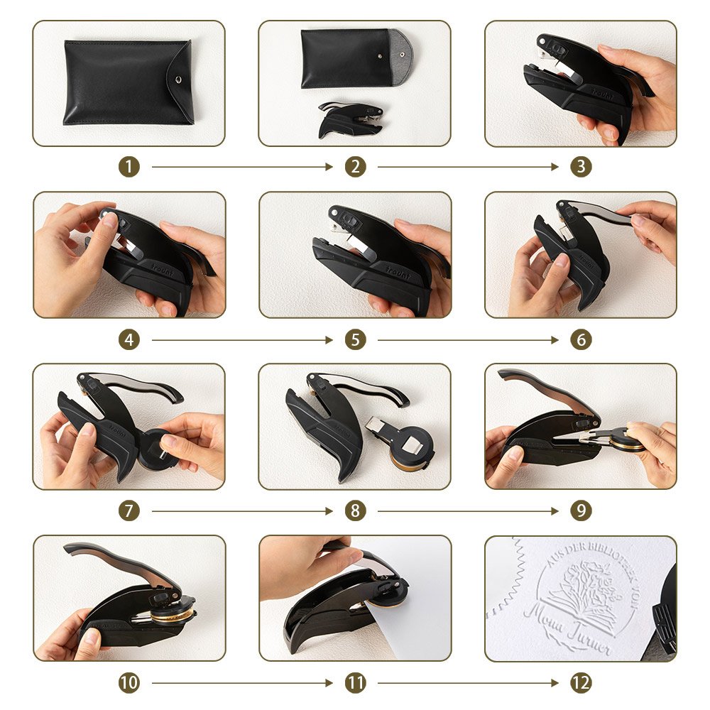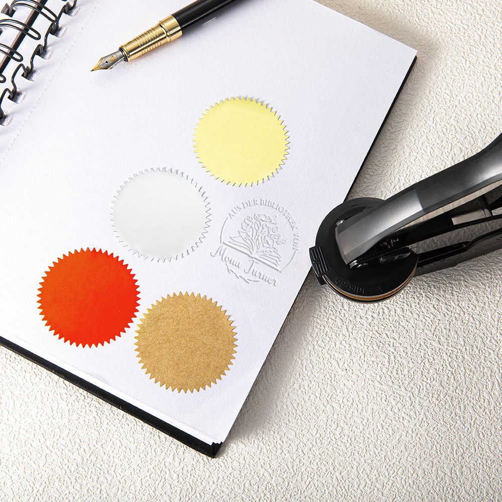 Dieser Prägestempel eignet sich nicht nur für Bücher, sondern für jeden Gegenstand, dem Sie einen Stempel aufdrücken möchten. Verwenden Sie ihn, um Ihren Namen oder Ihr Logo auf Umschläge, Zeitschriften, Briefe, Zertifikate und vieles mehr zu prägen. Er ist ein vielseitiges Werkzeug, das jeder Korrespondenz einen Hauch von Eleganz und Professionalität verleiht.