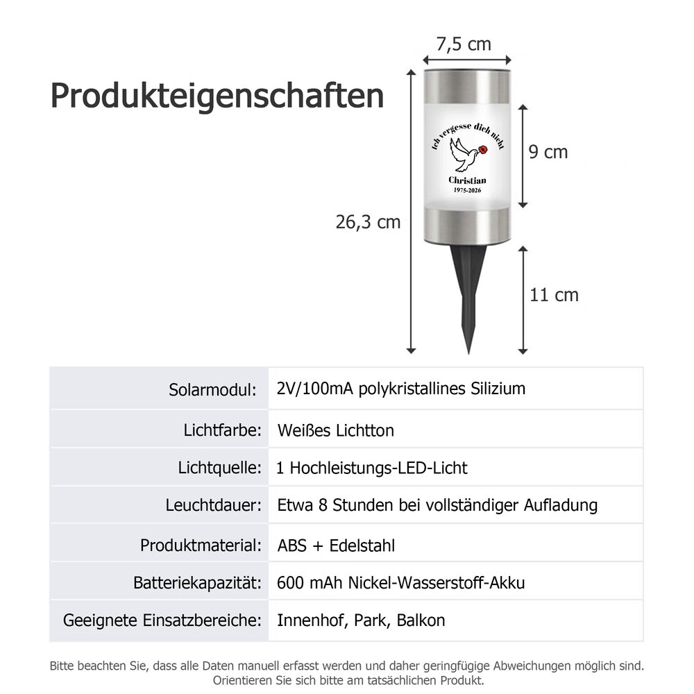 Dieses ganz besondere Präsent ist für trauernde Familien ebenso gedacht wie für alle, die eine liebevolle Möglichkeit suchen, verstorbene Angehörige und bewundernswerte Helden gebührend zu ehren. Es passt besonders gut für Gedenkorte im Freien – zum Beispiel Friedhöfe, Gedenkparks, Gärten oder Höfe – und schenkt ein warmes Licht, das Trost spendet und wertvolle Erinnerungen dauerhaft bewahrt.