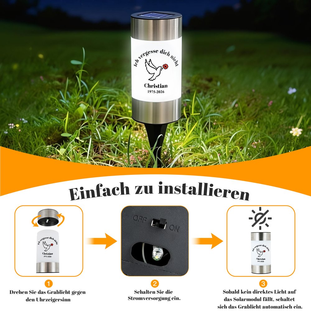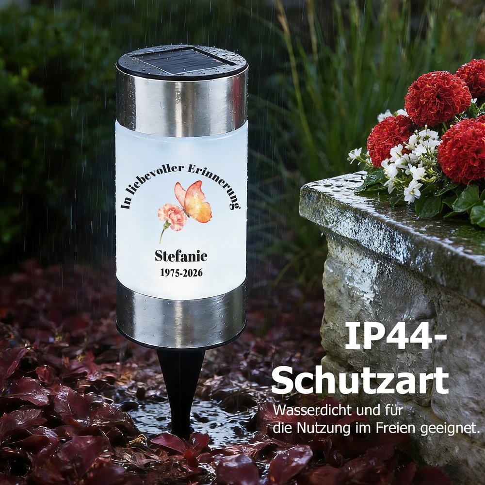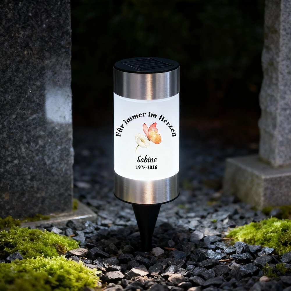Personalisiertes Solar Grablicht mit Blumen Taube und Schmetterling | Widmung und Namen | Garten | Friedhof | Erinnerung Geschenk für Hinterbliebene