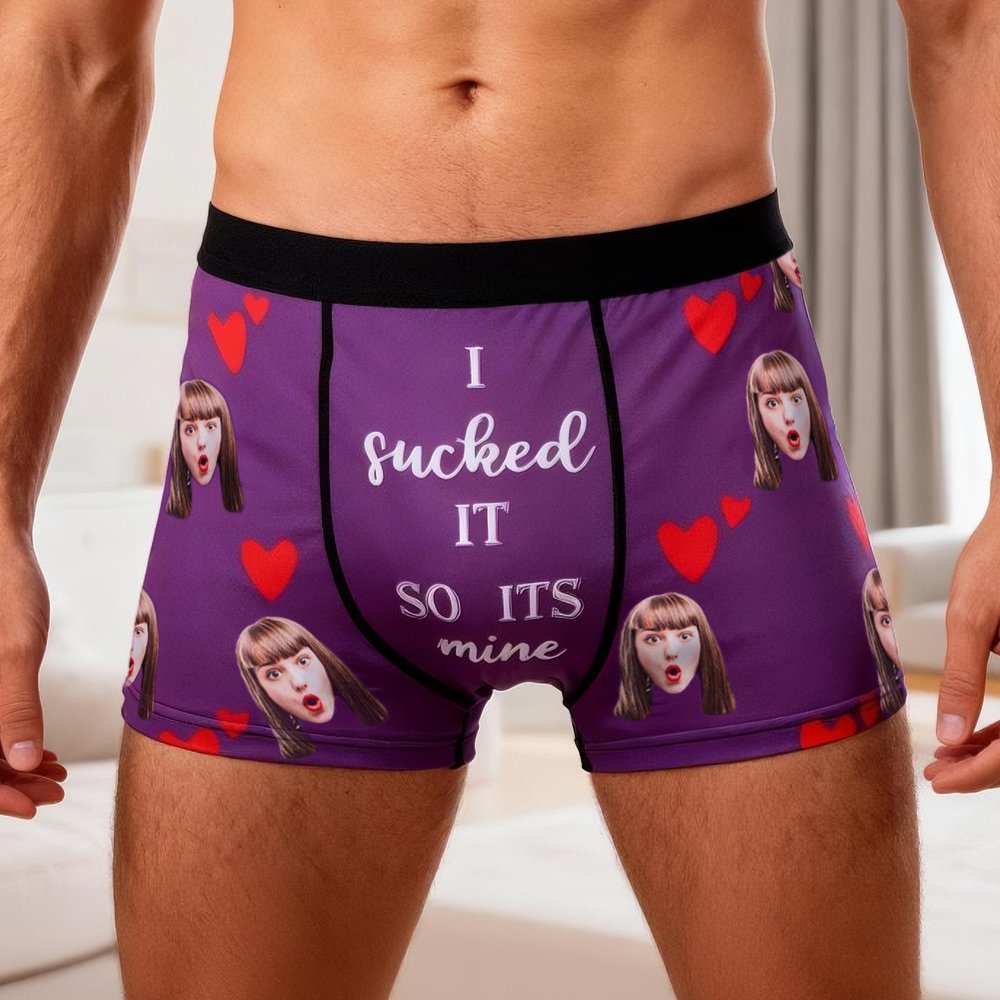 Der Ausdruck I Sucked It So It's Mine auf dem Boxershort sorgt für eine freche und verspielte Note. In Kombination mit den Liebesherzen entsteht eine lustige und unbeschwerte Atmosphäre. So können Sie Ihren Sinn für Humor zum Ausdruck bringen und Ihrem Partner zeigen, dass Sie ihn wertschätzen.