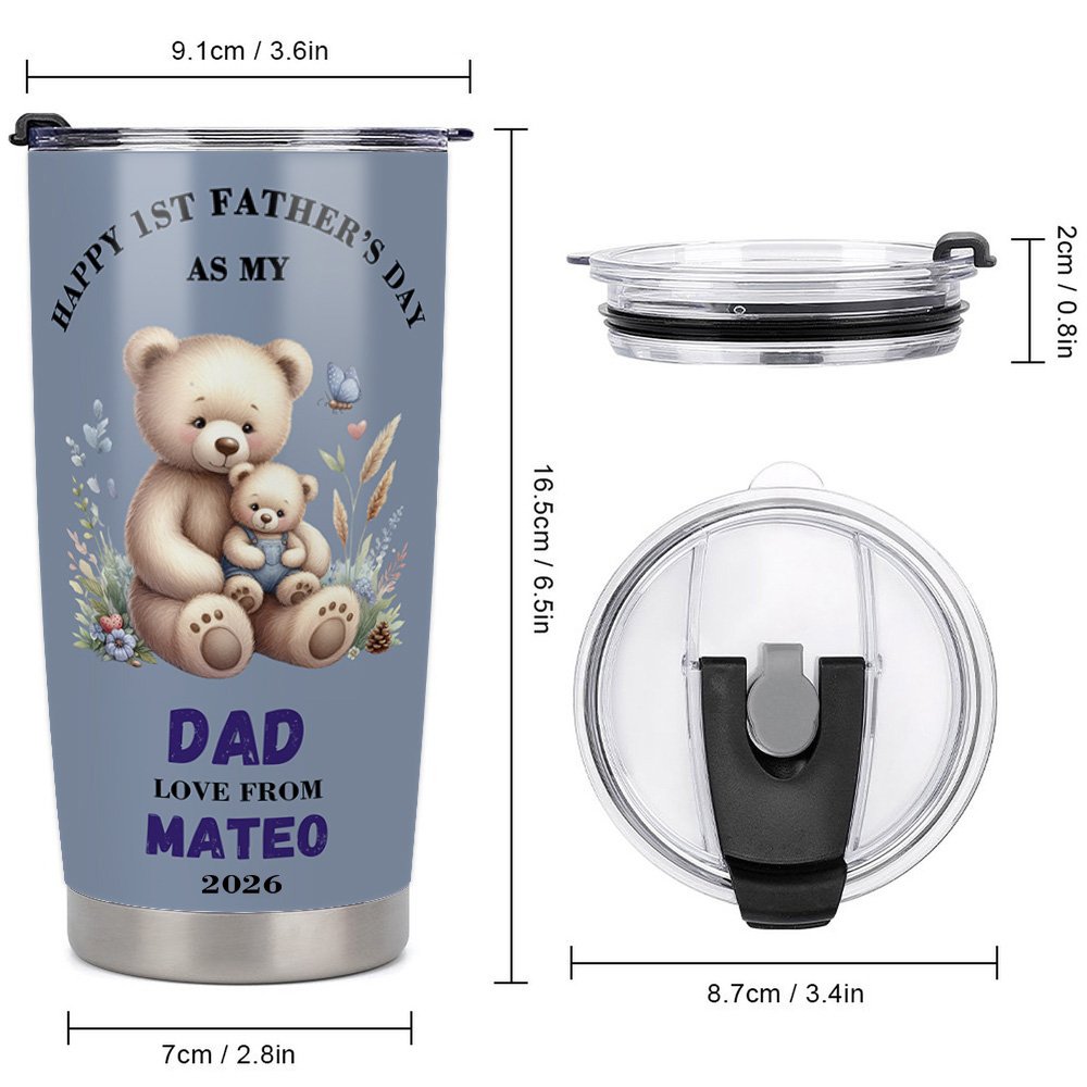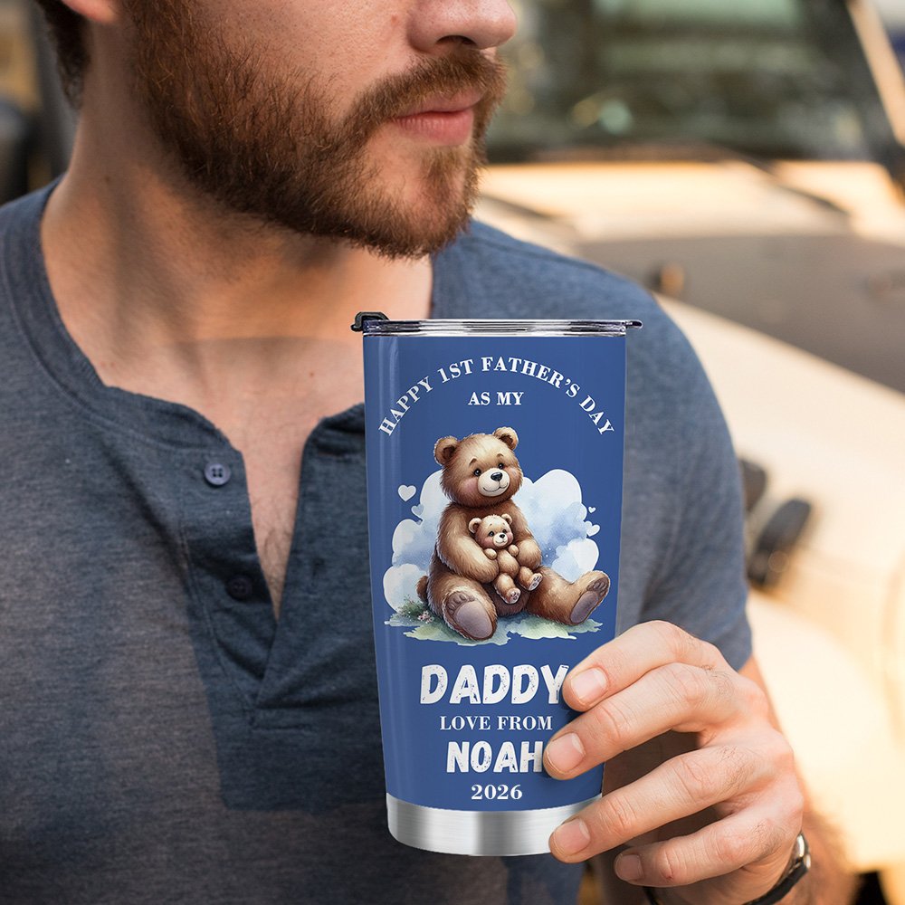Dieser 20 oz Becher im niedlichen Bärendesign verfügt über ein anpassbares Design, in das Sie sowohl den Namen des Vaters als auch den des Babys und das Geburtsjahr des Babys eintragen können. Feiern Sie den besonderen Meilenstein des Vatertags mit der Phrase "Happy Father's Day" oder einen persönlichen Text.