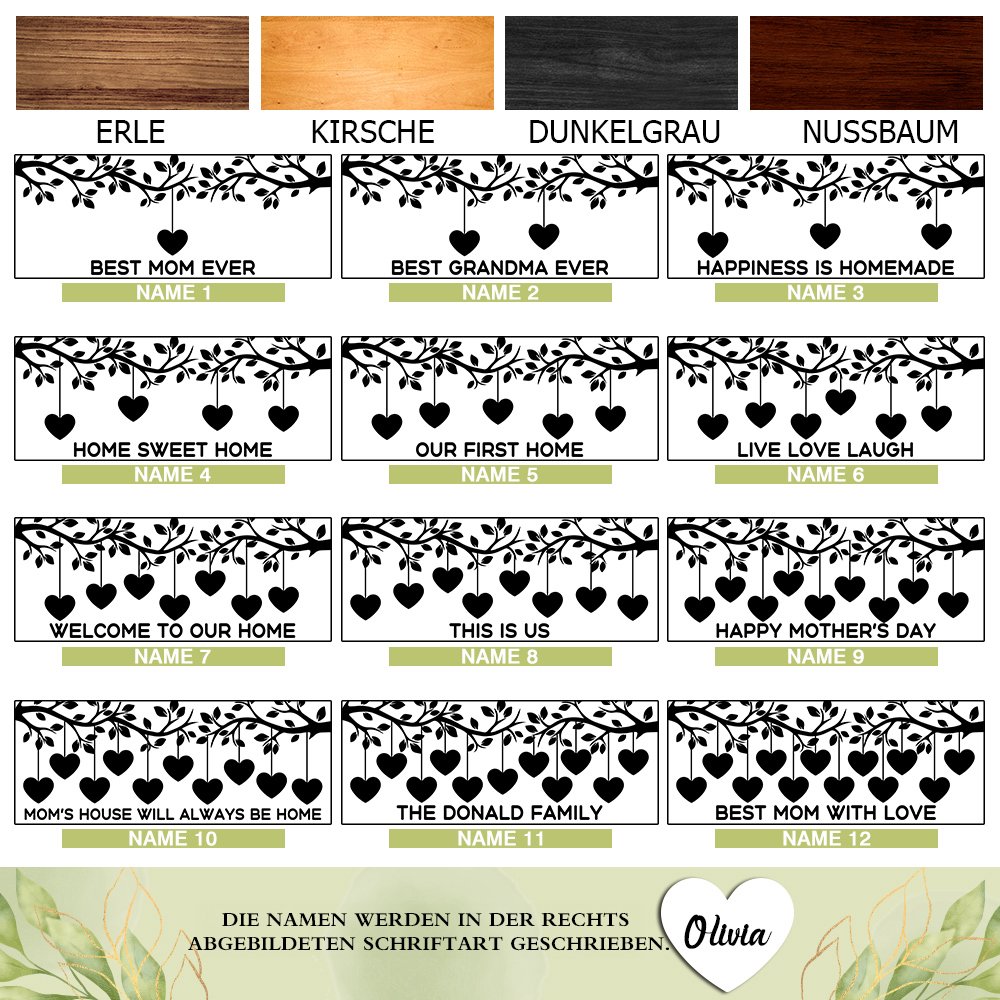 Das personalisierte Familienschild aus Holz zeigt eine zauberhafte Baum-Silhouette – ein Symbol für Stärke, Wachstum und die Verbundenheit eurer Familie. Jeder Zweig trägt zarte Herzen mit den Namen eurer Liebsten. Mit Platz für bis zu 12 Namen könnt ihr euren Familienbaum auf eine ganz besondere Weise verewigen.