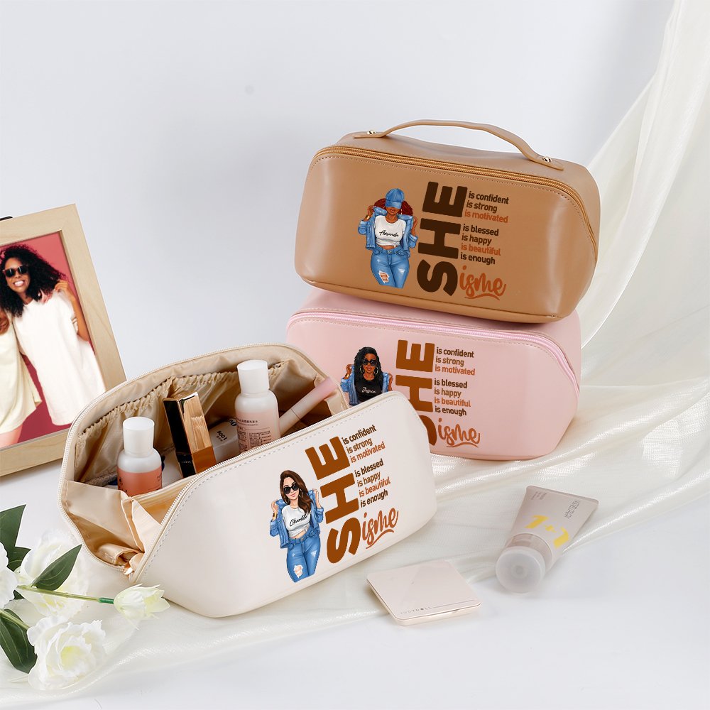 Die Vorderseite dieser Kosmetiktasche ist mit einem modischen Hip-Hop-Girl-Muster bedruckt, und das Mädchen trägt ein Jeans-Outfit. Das inspirierende Zitat "Sie ist selbstbewusst, stark, positiv, glücklich, fröhlich, schön und ausreichend" hebt die hervorragenden Eigenschaften von Frauen hervor. Du kannst deinen Namen hinzufügen, um ein einzigartiges Stück zu schaffen, das deine Persönlichkeit unterstreicht.