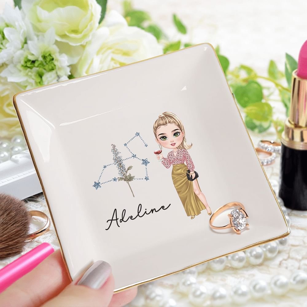 Diese Keramik-Schmuckschale ist eine perfekte Kombination aus Mode und Persönlichkeit. Jeder Teller ist mit Konstellationen und Geburt Blumen, mit lebendigen Comic-Figuren und wunderschöne Nachahmung Pailletten-Effekte, zeigt einen einzigartigen Sinn für Kunst thematisiert. Sie können Ihren Namen hinzufügen und das passende Cartoon-Design und Geburtsblumenkonstellations-Kombinationsmuster wählen, um Ihren einzigartigen Geschmack zu zeigen.