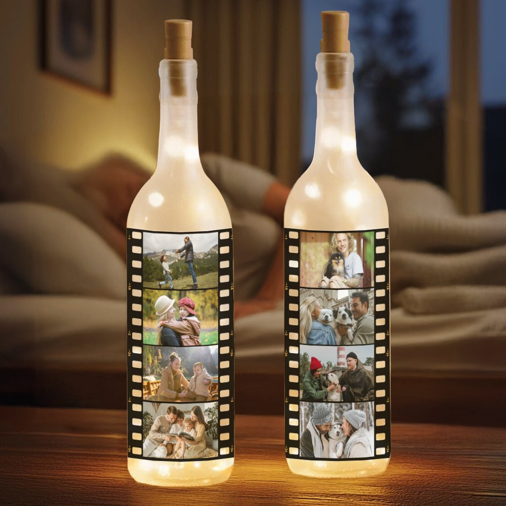 Auf dem Hauptbildschirm dieses Glasnachtlichts ist eine große Filmrolle in Form einer Rotweinflasche abgebildet. In der Mitte können Sie vier Fotos hochladen, um eine Collage zu erstellen. Dank der beidseitigen Gestaltungsmöglichkeit können Sie Ihre besonderen Erinnerungen auf kreative und künstlerische Art und Weise in Szene setzen. Eine perfekte Art, schöne Momente mit Familie und Freunden zu feiern.