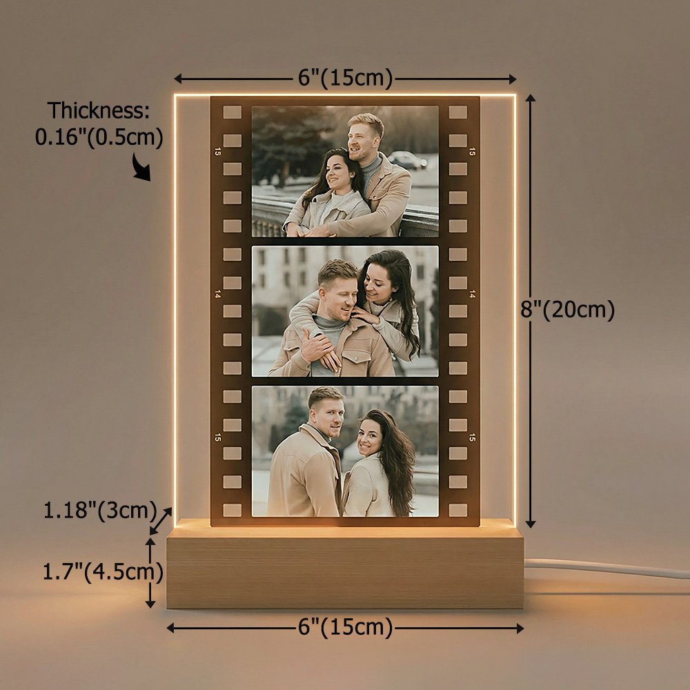 Optisch hat das Nachtlicht einen warmen, nostalgischen Stil. Die durchsichtige Acrylplatte ist mit einem schwarzen Filmstreifenrahmen mit 3 gedruckten Fotos versehen, und der Holzsockel strahlt ein sanftes LED-Licht aus, das die Bilder beleuchtet. Das Design verbindet den Charme alter Filme mit modernem Dekor und schafft so ein Stück, das sowohl funktional als auch voller sentimentaler Wärme ist.