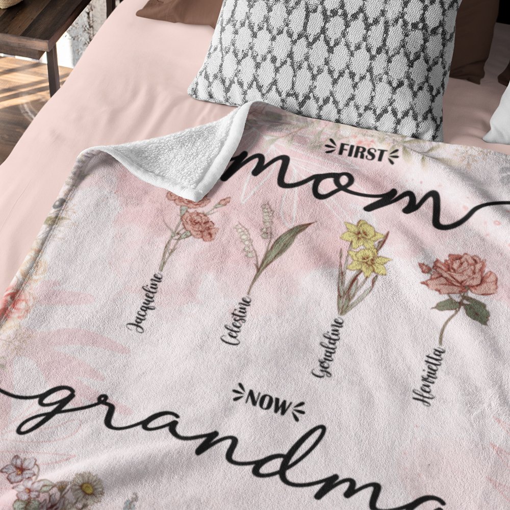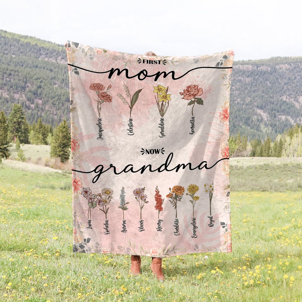 Mit der First Mom Now Grandma Geburtsblumen Decke können Sie die Geburtsblumen und Namen Ihrer Kinder und Enkelkinder individuell gestalten und so eine schöne und sinnvolle Verbindung zwischen den einzelnen Familienmitgliedern schaffen. Diese personalisierte Note feiert die Größe einer Großmutter oder Mutter und lässt sie wissen, dass sie geschätzt, geliebt und bewundert wird.