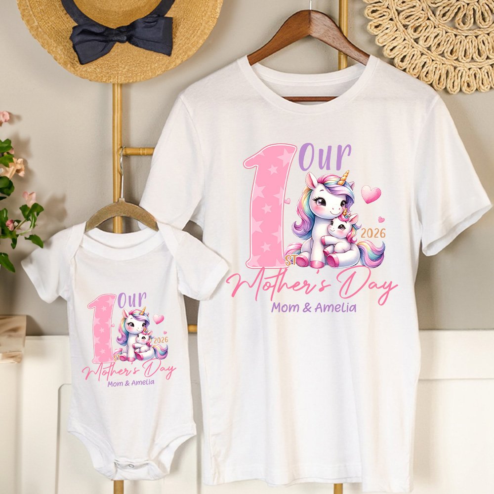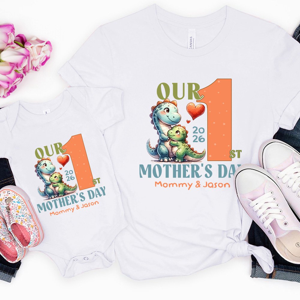 Dieses T-Shirt und der Baby-Body sind mit einem niedlichen Mutter-Kind-Tier bedruckt. Die Mutter und das Baby lehnen sich aneinander und zeigen eine starke Familienatmosphäre. Die warmen Worte "Our First Mother's Day" und die Namen der Kinder und der Mutter sind auf die Kleidung gedruckt, die ein Gefühl der Exklusivität verleiht.
