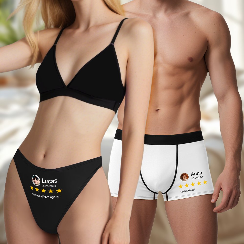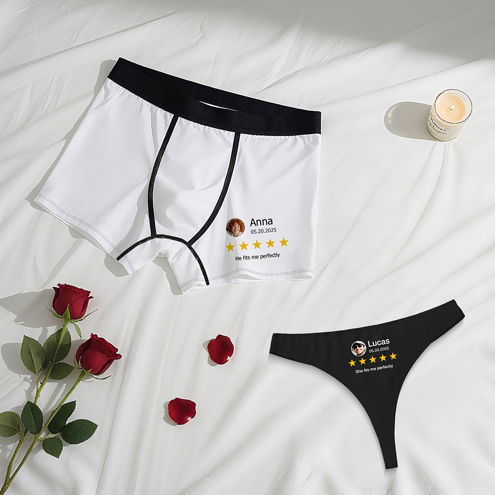 Inspiriert von Fünf-Sterne-Bewertungen, bringt dieses Unterwäsche-Design einen Hauch von Spaß und Selbstvertrauen in deinen Alltag. Du kannst sie personalisieren, indem du dein Foto hochlädst und den Bewertungstext, den Namen und das Datum anpasst, um ein einzigartiges Zeichen der Liebe und Kreativität zu schaffen. Wählen Sie aus 7 leuchtenden Farben Ihren Favoriten aus und feiern Sie süße Verbindungen zwischen Paaren.