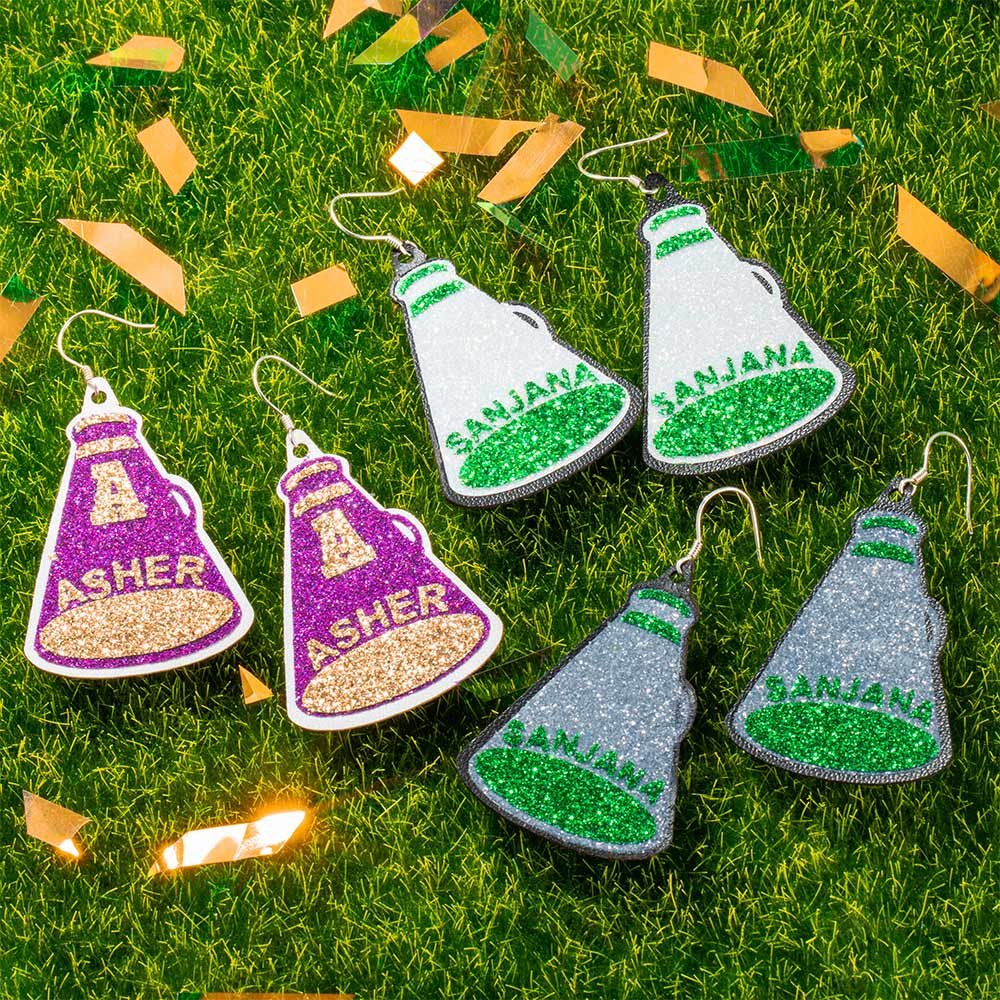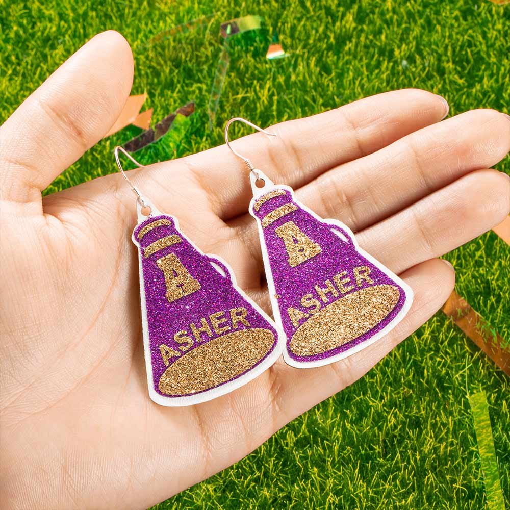 Diese personalisierten Glitzer-Cheer-Megaphon-Ohrringe sind in einer Vielzahl von Glitzerfarben erhältlich, sodass du sie an die Farben deines Teams oder deinen Stil anpassen kannst. Sie können sie mit jedem Teamnamen oder Spielernamen anpassen, so dass diese Ohrringe ein wirklich einzigartiges und persönliches Accessoire für Cheerleading-Fans.