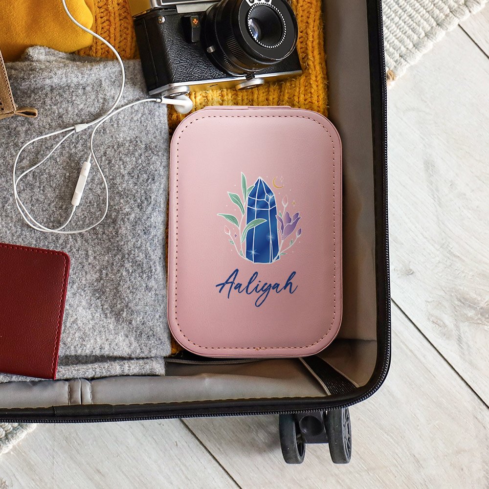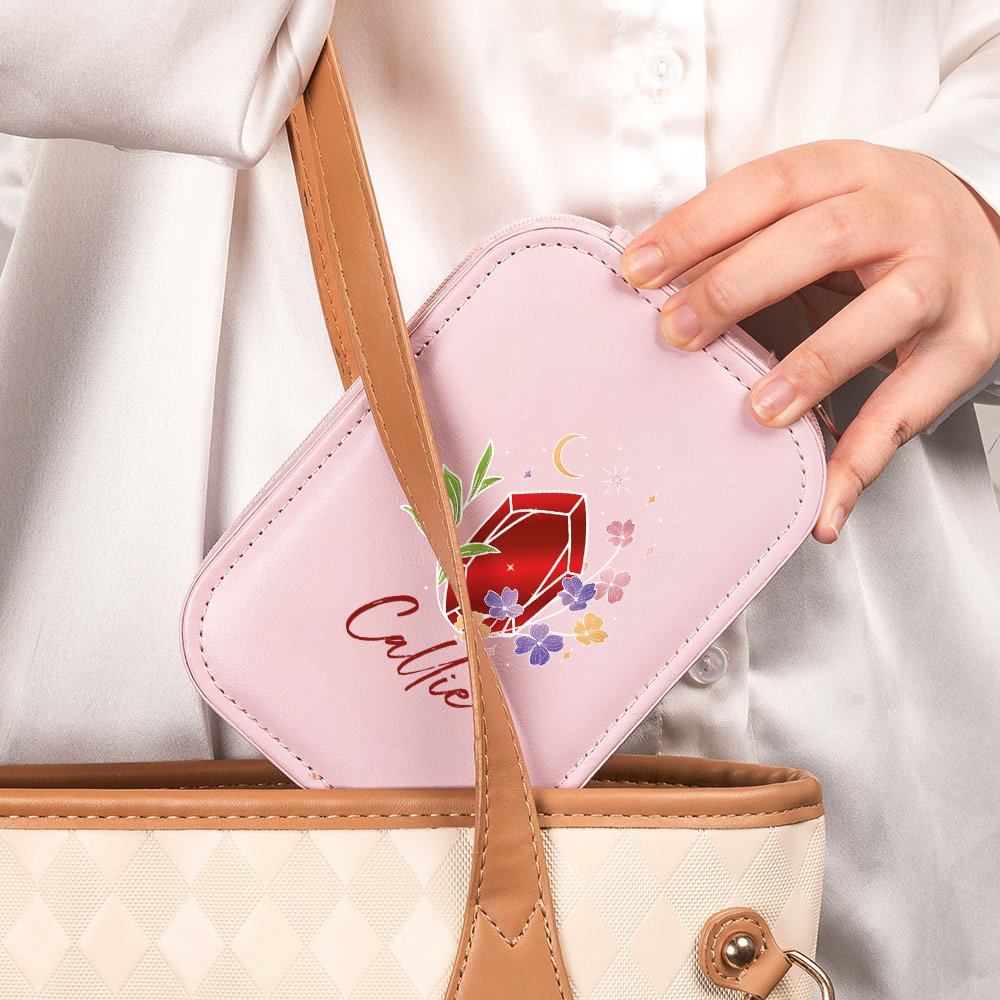 Dieses Schmuckkästchen zeigt den Geburtsstein als zentrales Designelement, umgeben von stilisierten Blättern, Blumen, Monden und Sternen, die eine verträumte und anspruchsvolle Atmosphäre schaffen. Um das Produkt einzigartig zu machen, können Sie es auch mit Ihrem Namen auf dem Deckel personalisieren.
