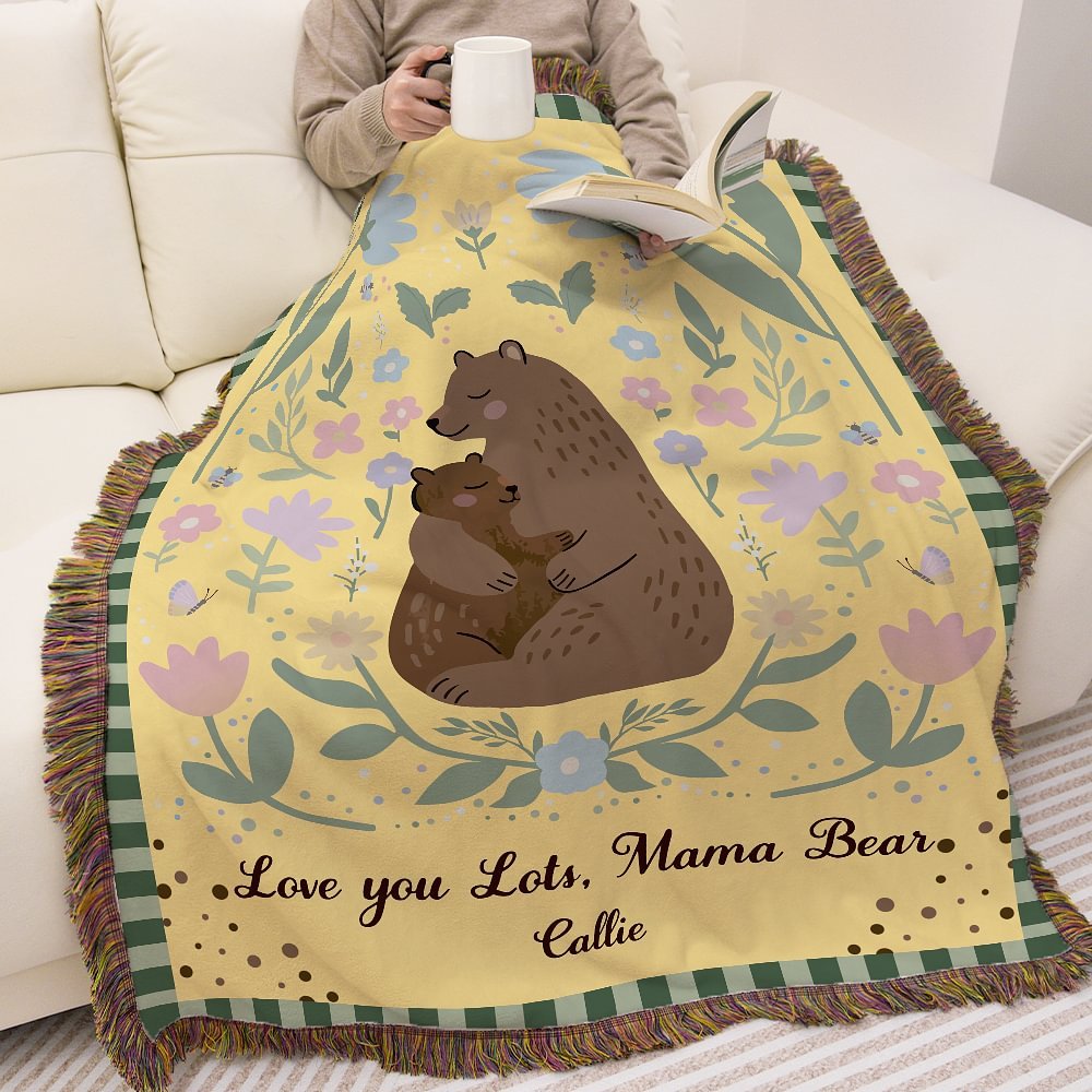 Diese Decke mit einem charmanten Mama-Bären im Cartoon-Stil und floralen Akzenten kann mit den Namen von Familienmitgliedern personalisiert werden, wodurch ein wirklich einzigartiges Stück entsteht. Das individuelle Design verleiht der Decke einen sentimentalen Touch, der die Familienbande zelebriert und dem Empfänger das Gefühl gibt, etwas ganz Besonderes zu sein.