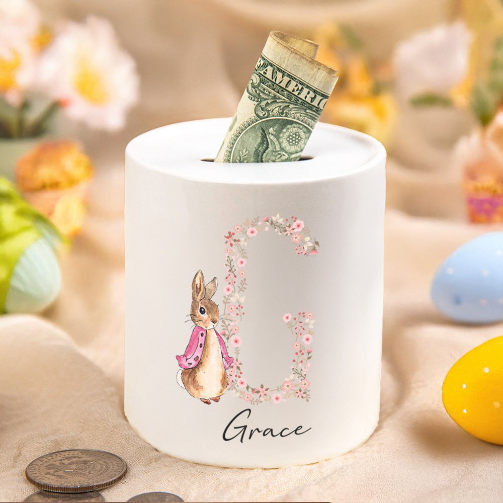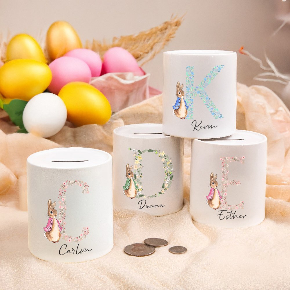 Diese bezaubernde Spardose ist mit einem Peter-Kaninchen-Motiv und Blumeninitialen versehen, die auf den Namen Ihres Kindes zugeschnitten sind und ihm eine einzigartige Note verleihen. Sie ist ein besonderes Andenken, das Kinder im Laufe ihres Lebens in Ehren halten werden.