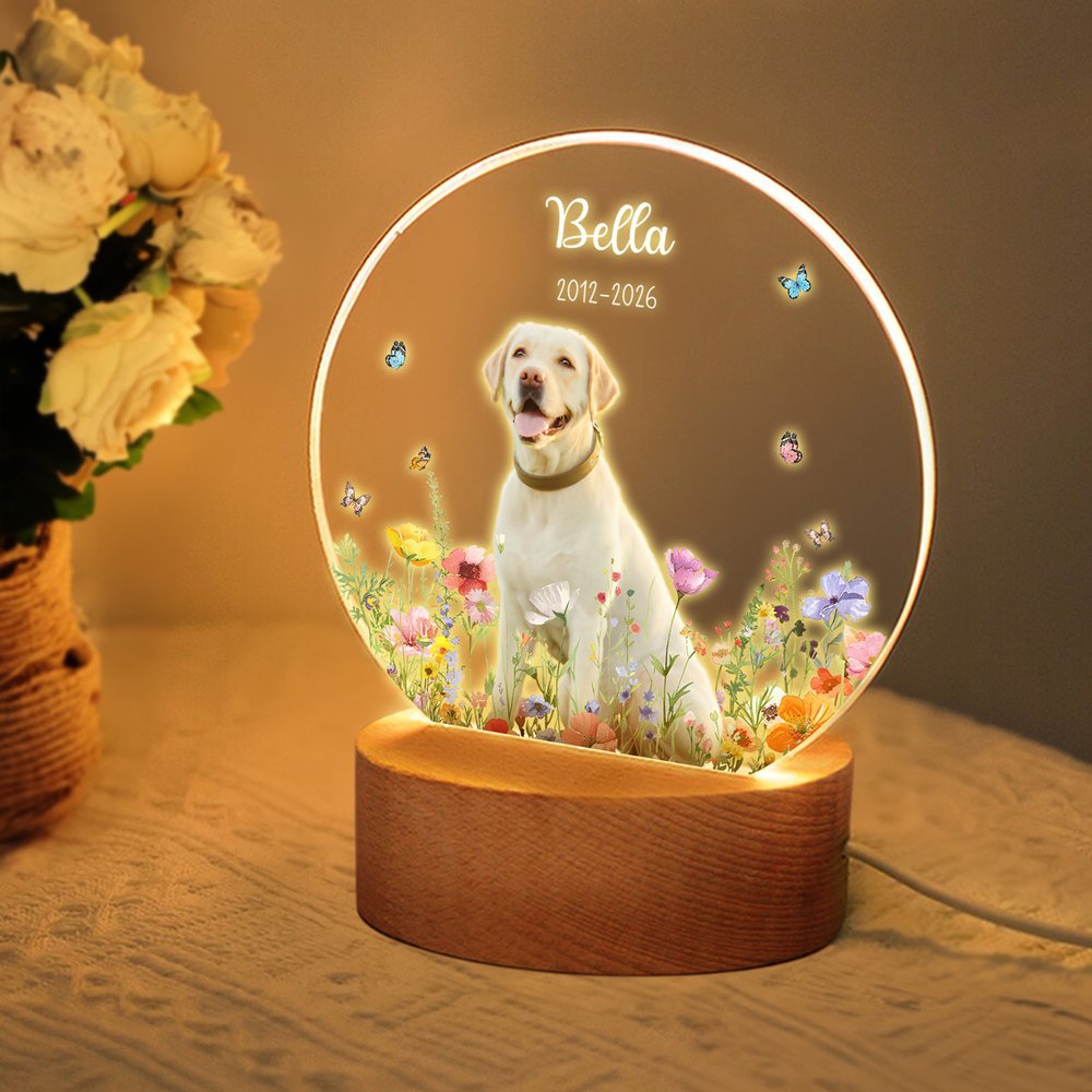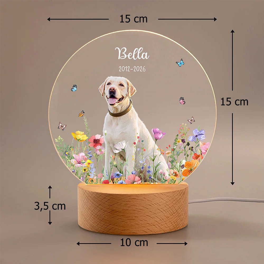 Dieses Nachtlicht zeigt einen floralen Hintergrund, der das persönliche Foto Ihres geliebten Haustiers wunderschön einrahmt und Ihrer Zuneigung sowie Ihren Erinnerungen eine greifbare Form verleiht. Mit dem Namen Ihres Haustiers und einem besonderen Datum personalisiert wird jedes Nachtlicht zu einem einzigartigen Erinnerungsstück – sei es, um gemeinsame schöne Momente zu feiern oder an einen verstorbenen tierischen Gefährten zu erinnern. Es bietet eine sanfte, beständige Präsenz, die Ihr Haustier im Herzen und im Blick behält.