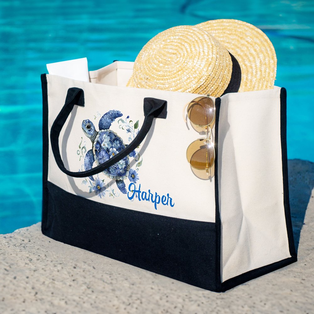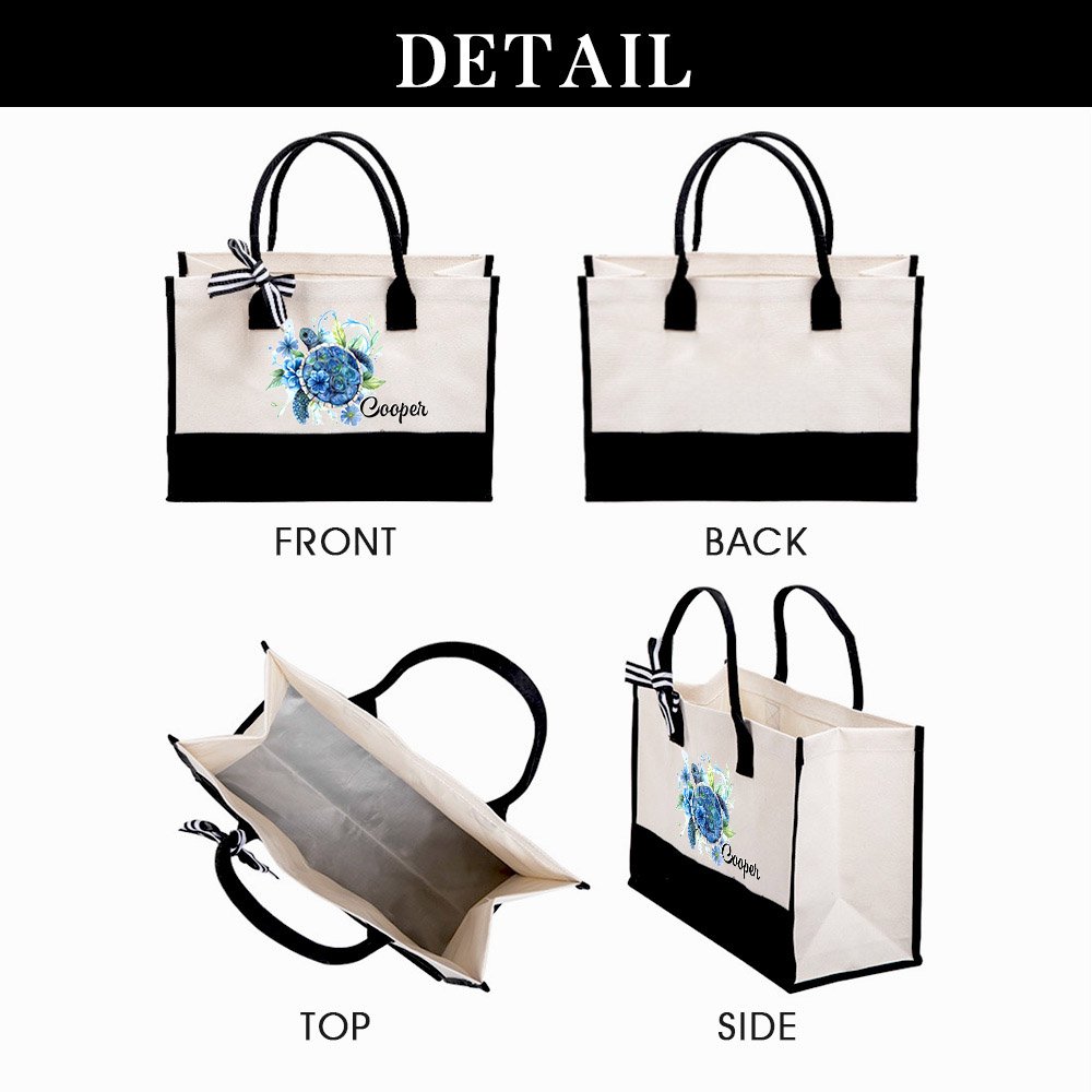 Wählen Sie aus 18 floralen Schildkrötenmustern auf der Vorderseite und personalisieren Sie sie mit Ihrem exklusiven Namen. Dieses Design kombiniert Meeresromantik mit persönlichen Symbolen und macht die Tasche zu einem herausragenden Stück, mit dem Sie Ihren Stil unterstreichen oder ein Geschenk machen können.