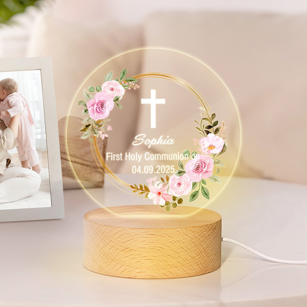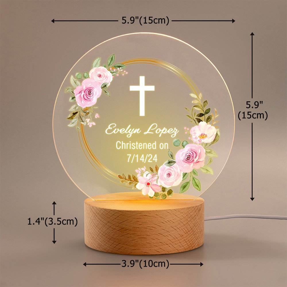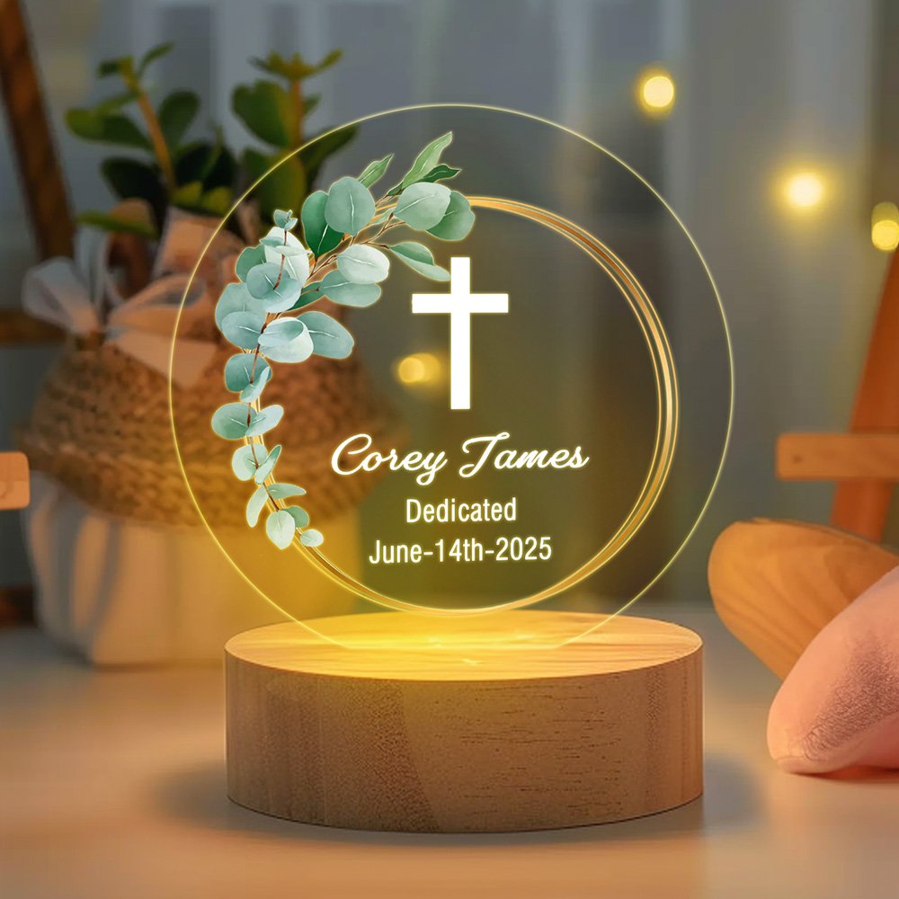 Dieses LED-Nachtlicht zeigt ein wunderschön gestaltetes Kreuz, das von einem zarten Blumen- oder Blätterkranz umgeben ist und Glaube, Liebe und Segen symbolisiert. Personalisieren Sie es mit einem Namen, einem Datum oder einer besonderen Nachricht, um es wirklich einzigartig zu machen.