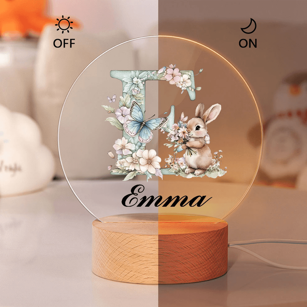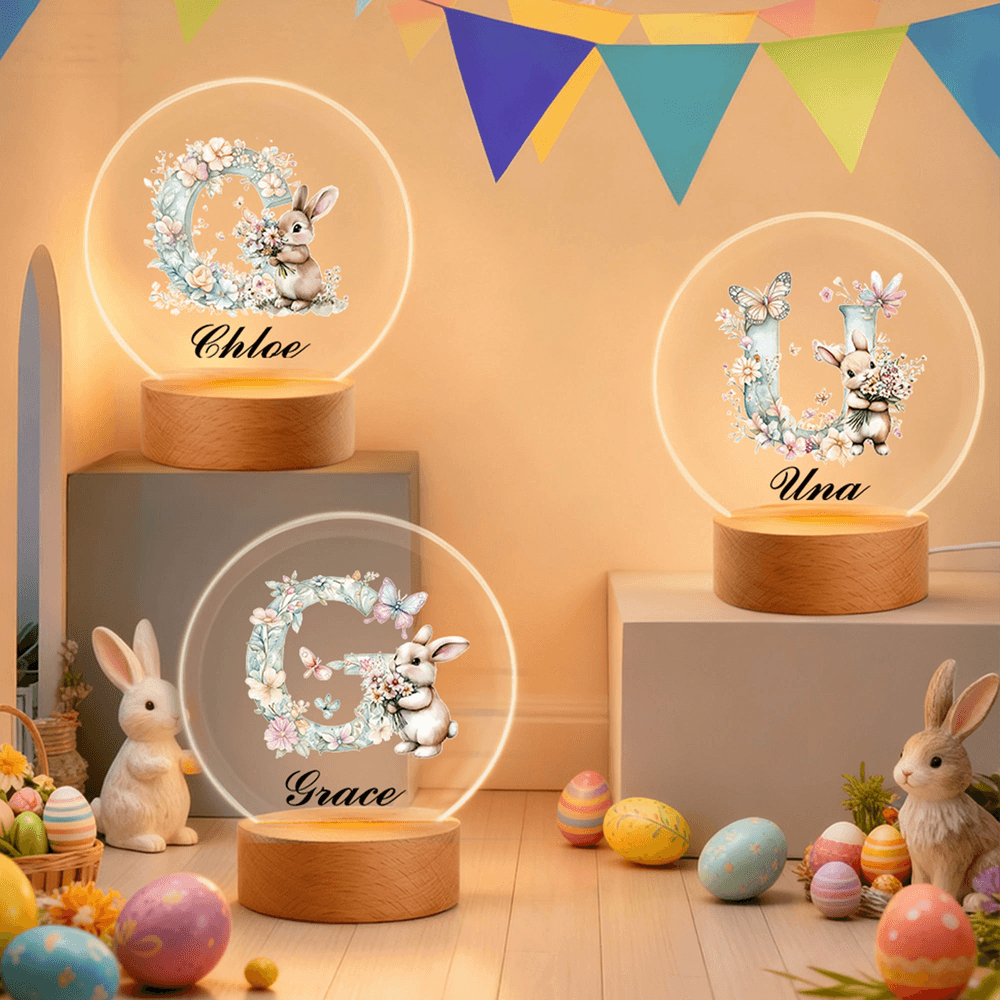 Personalisierte Blume Kaninchen Initiale LED-Nachtlicht mit Namen und hölzerne Basis Raumdekoration Geburtstag Ostern Party Favor Geschenk für Kinder