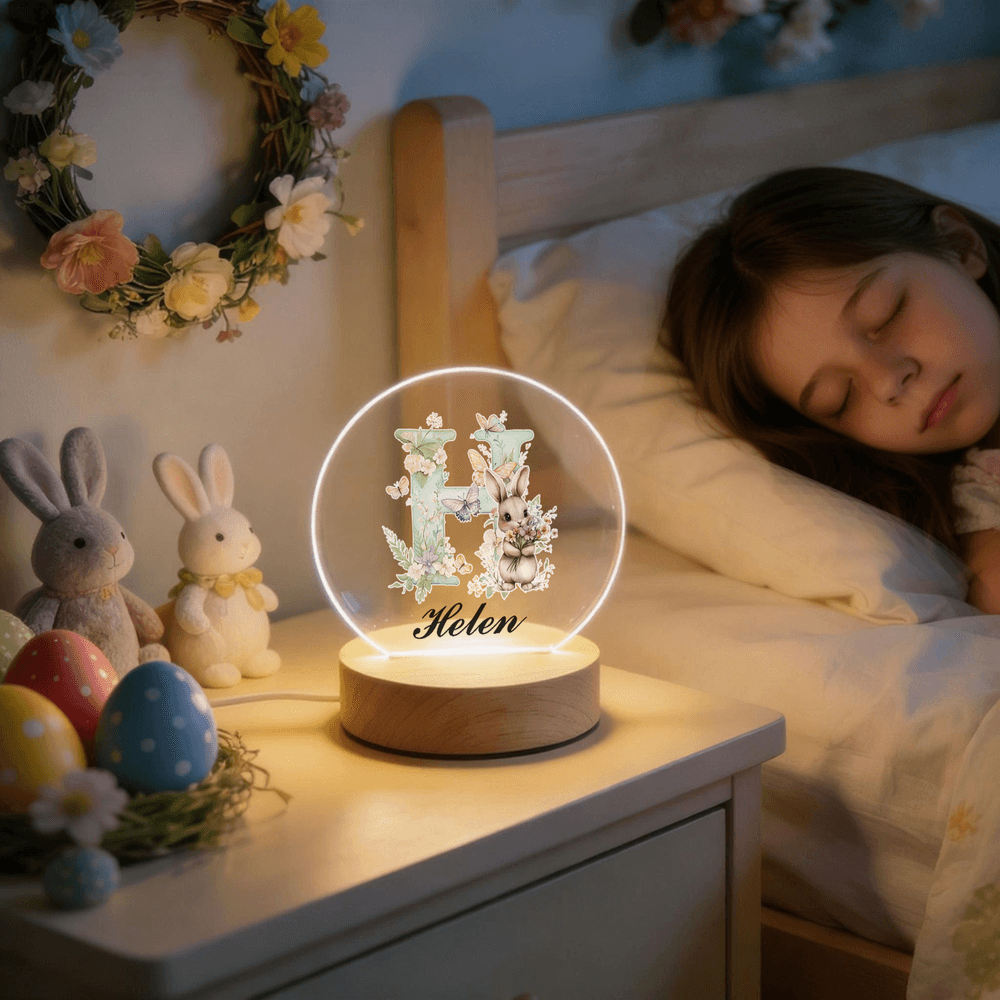 Dieses bezaubernde Nachtlicht zeigt einen charmanten Hasen, der einen Blumenstrauß in der Hand hält, umgeben von bunten Ostereiern, mit der zusätzlichen Möglichkeit, es mit einem Namen zu versehen. Das niedliche Design sorgt für eine verspielte Note und schafft eine festliche Atmosphäre, die das Zimmer Ihres Kindes aufwertet und gleichzeitig seine einzigartige Persönlichkeit zur Geltung bringt.