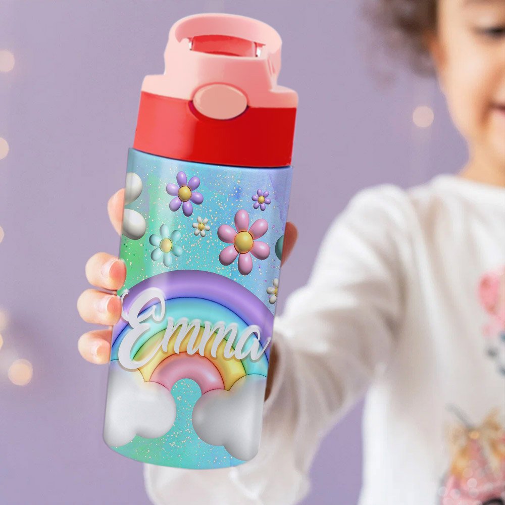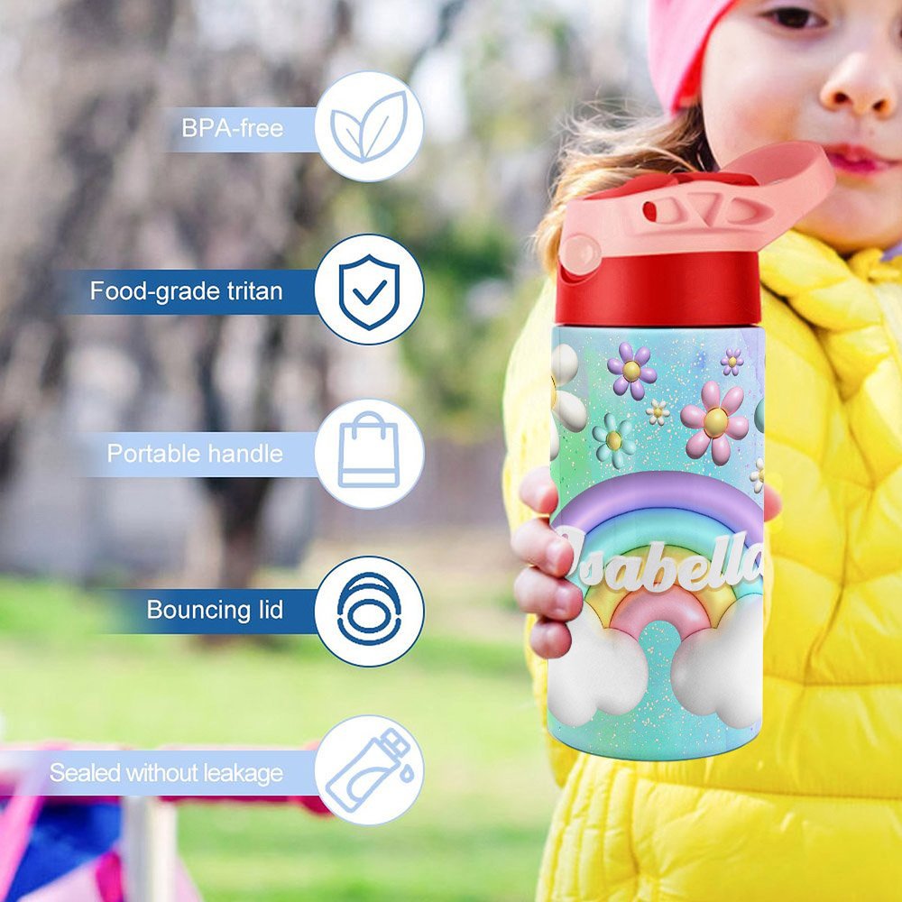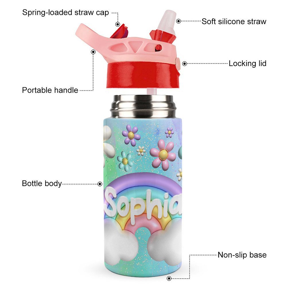 Das Design der Wasserflaschen ist sehr lebendig und schön. Die Flaschen sind mit Blumen, Regenbögen und weißen Wolken bemalt. Der Regenbogen kann auch mit dem Namen des Kindes angepasst werden, so dass die Wasserflasche mehr besonders ist.