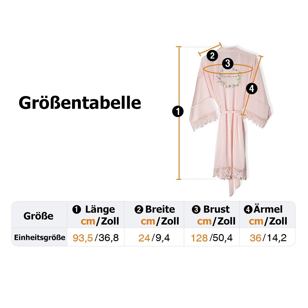 Der wunderschöne Schriftzug „Bride“/„Bridesmaid“/„Babe“ und zarte Blumendrucke sind auf dem Rücken des Bademantels aufgedruckt. Mit sexy V-Ausschnitt, halben Ärmeln und knielangem Schnitt. Eine abnehmbare Schärpe in der Taille kann geschlossen gehalten werden und passt sich perfekt an den Körper an. Sie sind die perfekte Brautrobe und Brautjungfer-Robe.