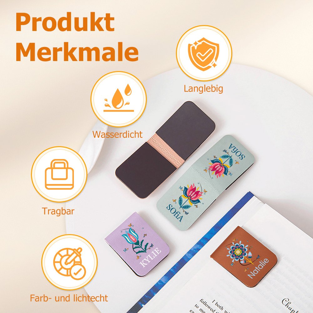 Hergestellt aus hochwertigem PU-Leder ist dieser Lesezeichenclip langlebig, widerstandsfähig und fühlt sich glatt und warm an. Er ist resistent gegen Verformungen und Beschädigungen. Die bedruckten Muster und Namen sind klar und langlebig, mit Farben, die eine lange Haltbarkeit aufweisen und nicht leicht verblassen. Auch bei häufiger täglicher Nutzung bleibt er in einwandfreiem Zustand. Die glatten, gratfreien Kanten beschädigen die Seiten beim Gebrauch nicht. Das magnetische Verschlussdesign sorgt für einen sicheren Halt.