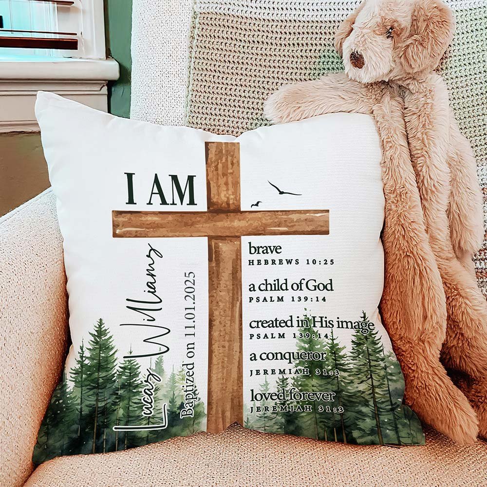 Dieser Kissenbezug bietet einen atemberaubenden Waldhintergrund mit einem wunderschön illustrierten Kreuz, was ihn zu einem wirklich fesselnden Stück macht. Die persönliche Note mit dem Namen Ihres Kindes und dem Datum des besonderen Anlasses verleiht ihm ein einzigartiges Flair. Die aufmunternden Bibelverse wie "Ich bin mutig", "ein Kind Gottes" und "für immer geliebt" bieten Ermutigung und Inspiration.