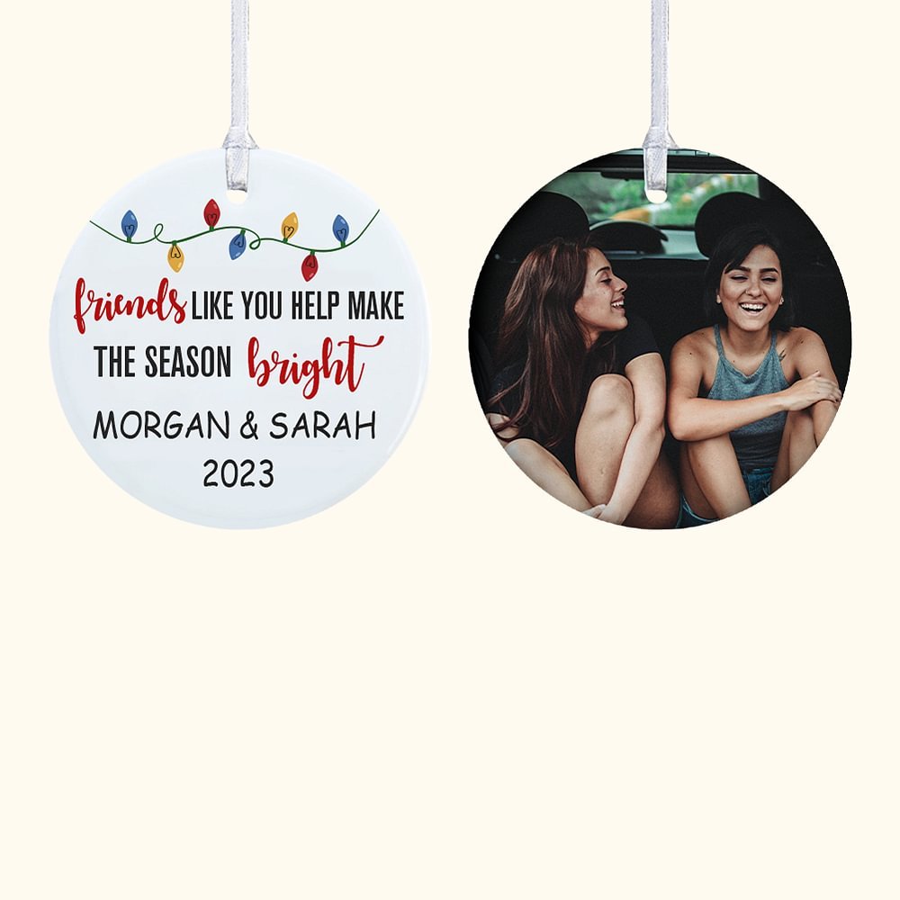 Ein Lichtstreifen wird mit einem weißen Hintergrund gepaart, um die weihnachtliche Atmosphäre zu unterstreichen und ein bisschen Schönheit und Spaß hinzuzufügen. Der Slogan "Friend Like You" mit individuellem Namen und Jahreszahl unterstreicht die einzigartige Beziehung, die Sie zu Ihrem Freund haben, und vermittelt Ihre wahre Liebe zu Ihrem Freund.