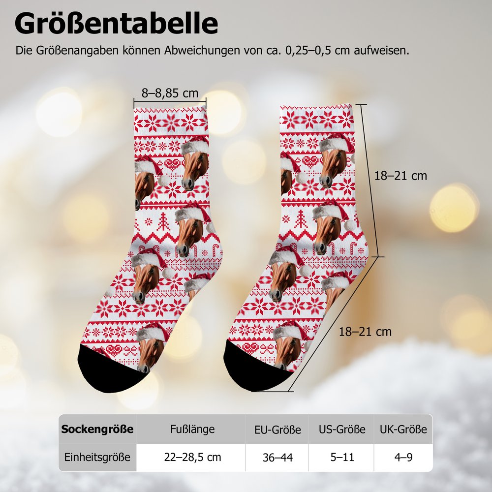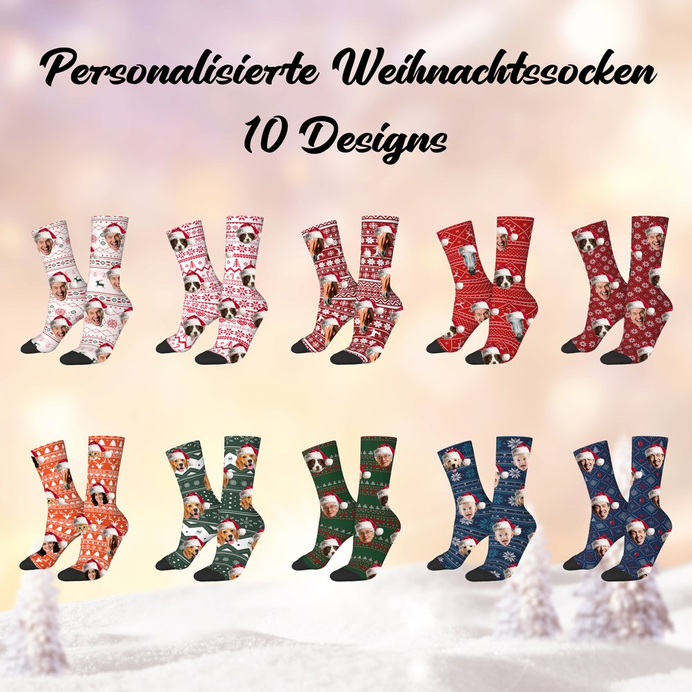 Diese Socken sind mit nordischen Weihnachtselementen versehen, mit lebendigen Hintergründen und anpassbaren Gesichtsdesigns, die jedes Paar zu einem echten Unikat machen. Sie können 1–3 Fotos einfügen und so Ihre Individualität und Kreativität unter Beweis stellen. Das optionale Design der Weihnachtsmütze sorgt für einen lustigen Touch und verstärkt die festliche Atmosphäre, damit Sie auf Partys oder Familientreffen auffallen.