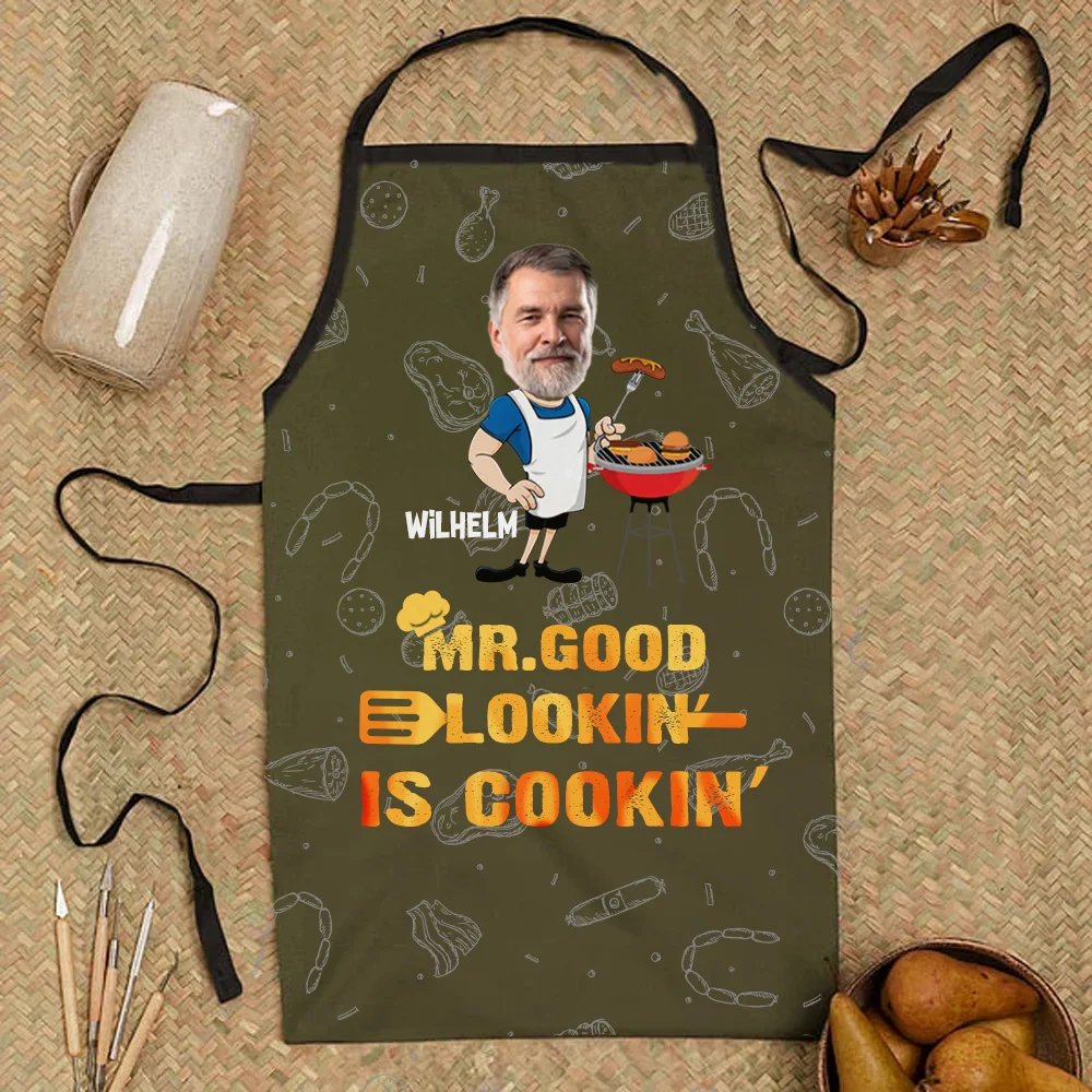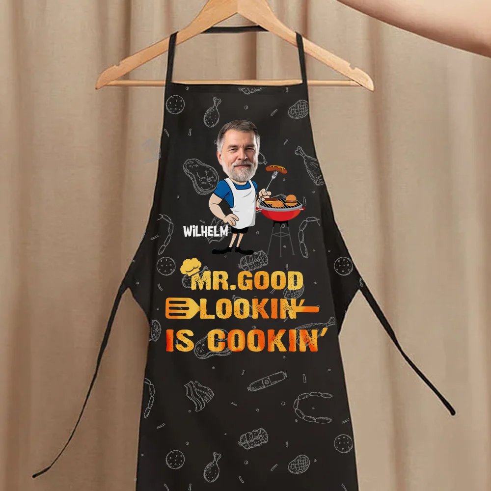Diese Grillschürze ermöglicht es Ihnen, sowohl das Foto als auch den Namen ganz nach Ihren Wünschen anzupassen. So entsteht eine einzigartige Schürze, die sich deutlich von anderen abhebt. Der markante Schriftzug „MR. GOOD LOOKIN' IS COOKIN'“ verleiht der Schürze eine charmante und humorvolle Note und zeigt auf besondere Weise, wem sie gehört.