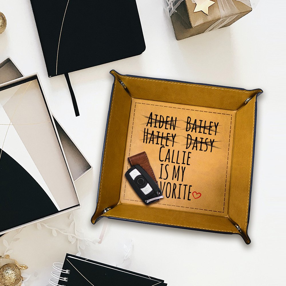 Das Tablett verfügt über ein humorvolles und lustiges Design, wobei die Namen, die gelöscht werden, die Namen der anderen Geschwister sind und die Namen, die beibehalten werden, Ihre eigenen sind, als Geschenk für Papa, Großvater oder andere männliche Ältere. Bringen Sie den freundschaftlichen Wettbewerb zwischen Geschwistern auf humorvolle Weise zum Ausdruck, um die Aufmerksamkeit der Älteren zu erregen.
