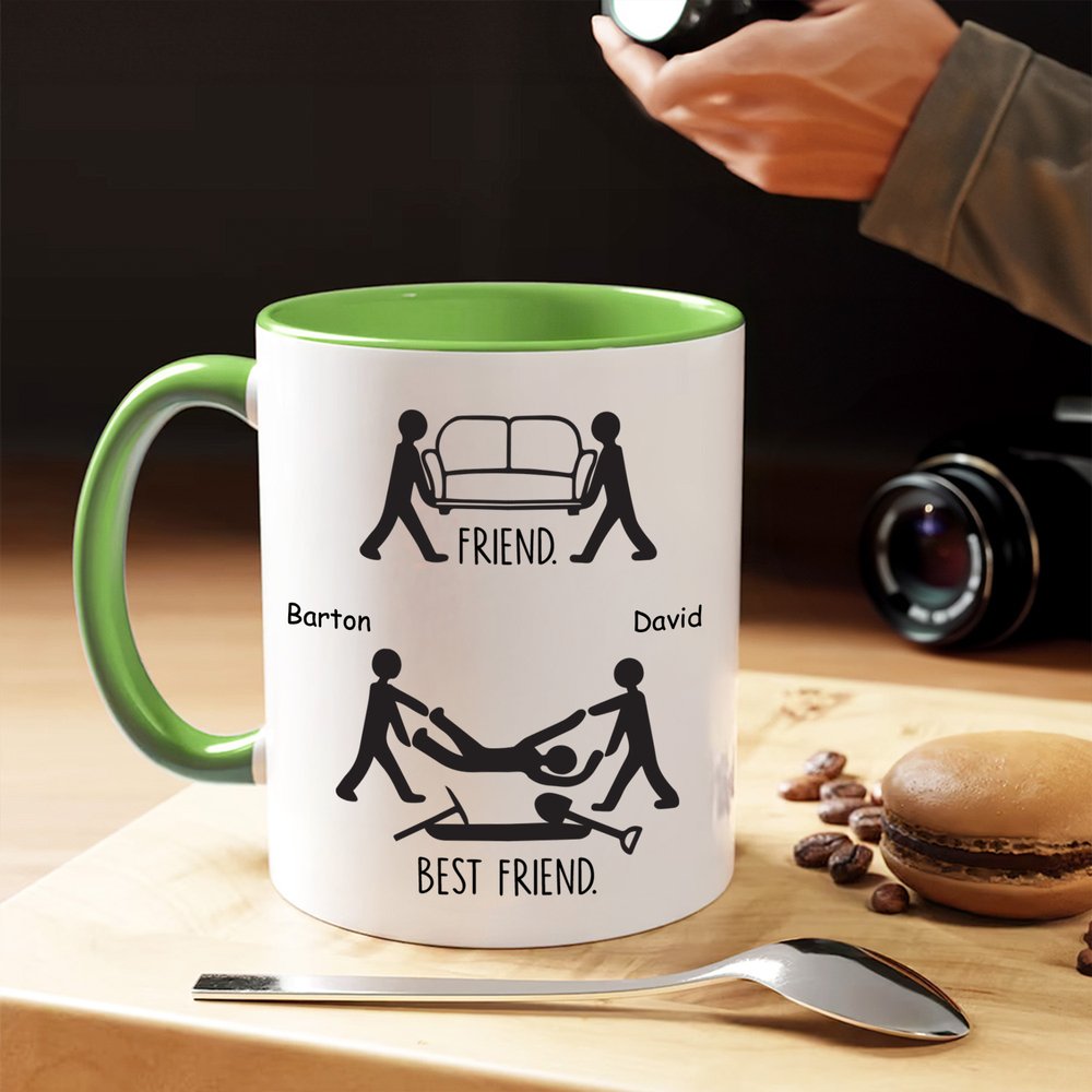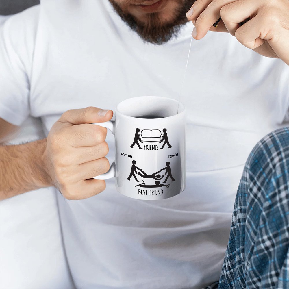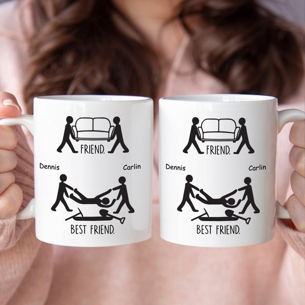 Die Tasse zeigt mit Strichmännchen den Unterschied zwischen Freunden und guten Freunden auf und wird von den Namen der beiden Personen begleitet. Dieser liebevolle und humorvolle Ausdruck verwandelt jeden Trinkspruch in ein stilles, wissendes Lächeln und fängt die besondere Freundschaft zwischen engen Freunden perfekt ein.