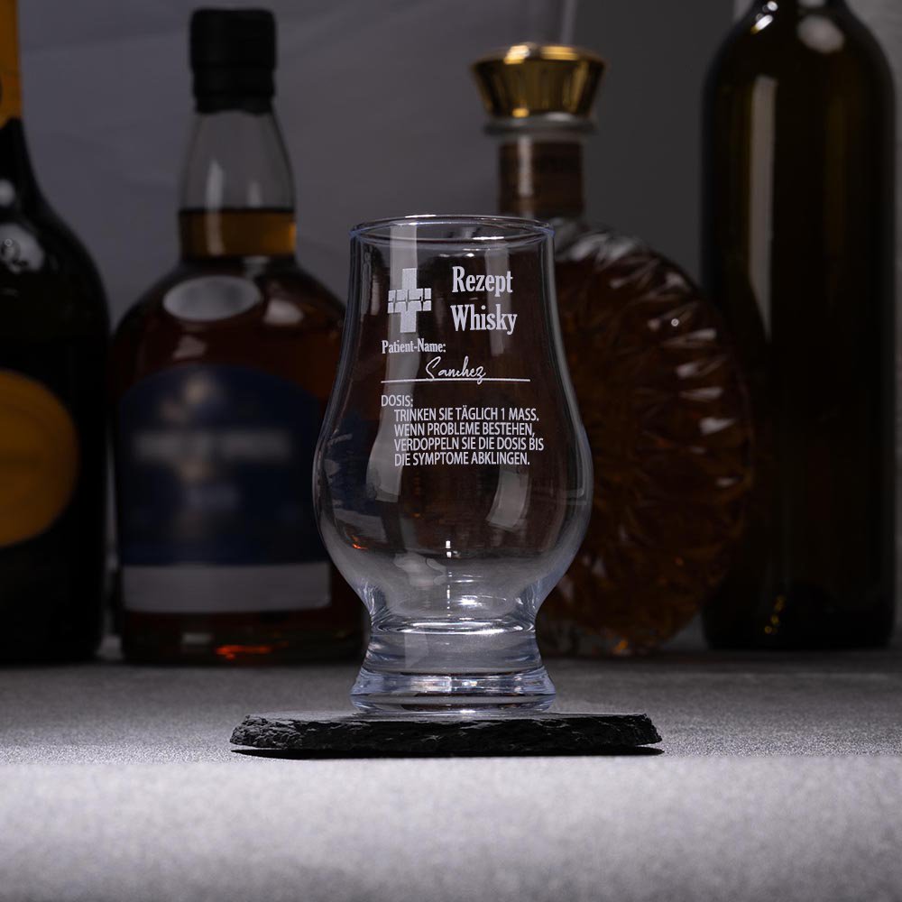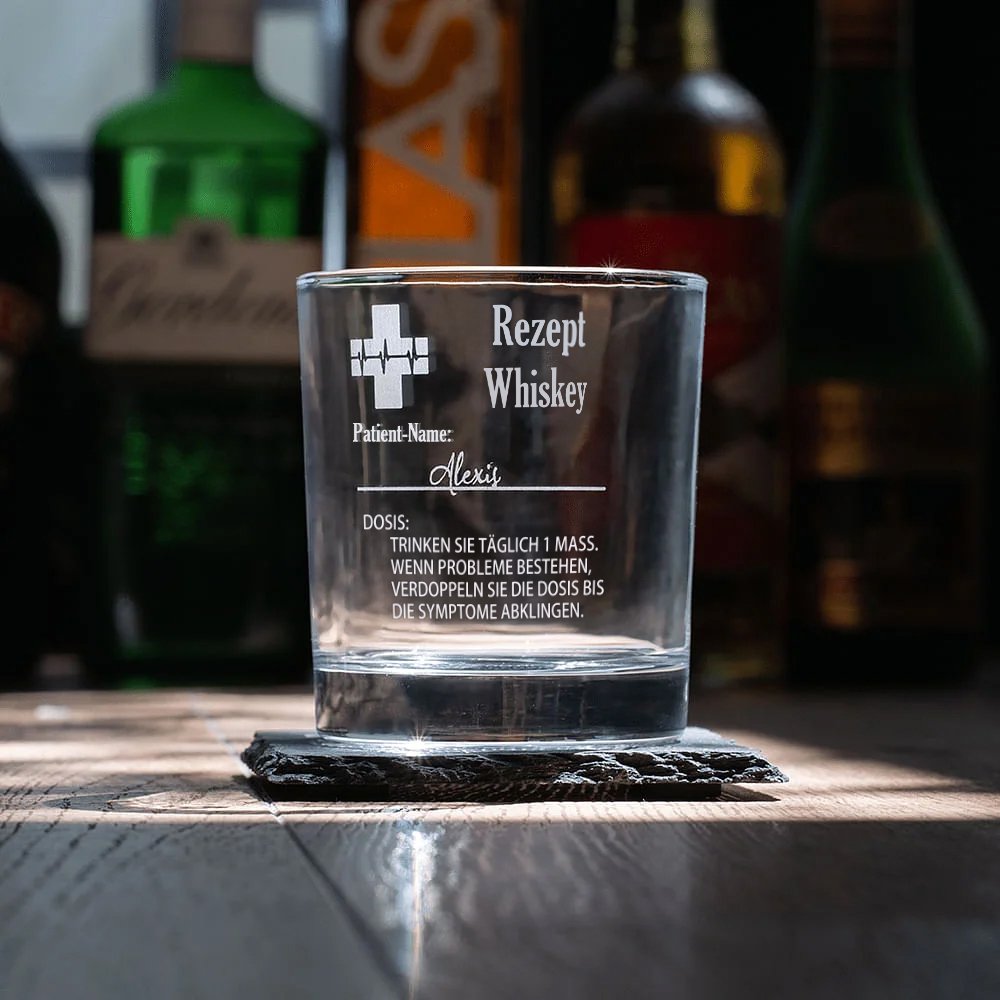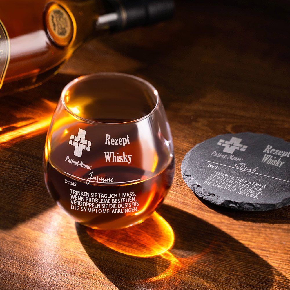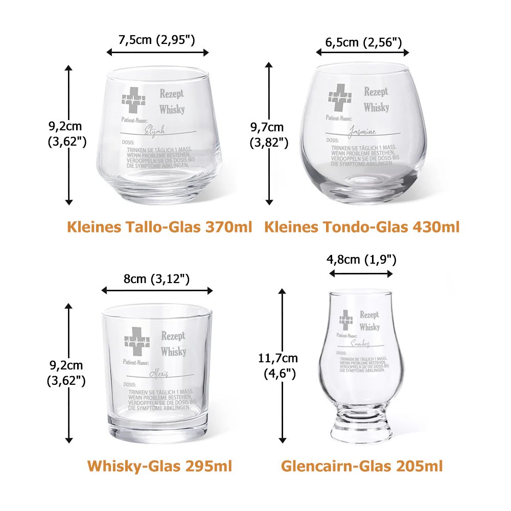 Wählen Sie aus vier verschiedenen Gläsern - Whiskey-Glas, Glencairn-Glas, kleines Tallo-Glas oder kleines Tondo-Glas - und personalisieren Sie sie mit einem eingravierten "Rezept"-Etikett und dem Namen des Empfängers, der Art des Rezepts und dem Namen des Alkohols für eine einzigartige und humorvolle Note.