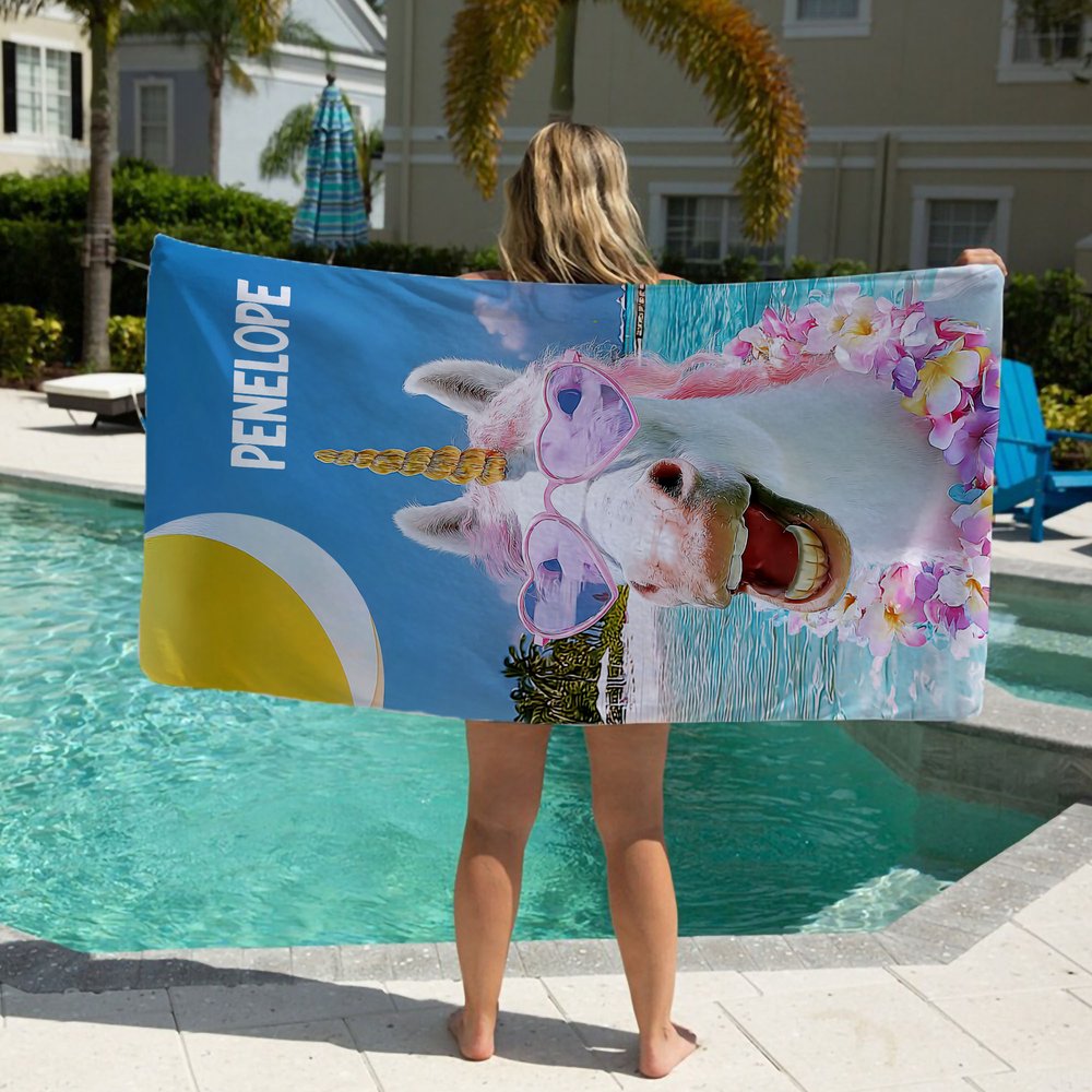 Dieses Strandtuch zeigt witzige Tiermotive mit stylischen Sonnenbrillen und farbenfrohen tropischen Blumenkränzen, die Urlaubsstimmung ausstrahlen. Wählen Sie aus lustigen Mustern wie Zebras, Bulldoggen, Giraffen, Fantasie-Einhörnern und Flamingos - alles in kräftigen, auffälligen Farben, die Ihren Strandtagen einen skurrilen Touch verleihen. Fügen Sie Ihren Namen hinzu und verleihen Sie ihm ein einzigartiges, stilvolles Flair.
