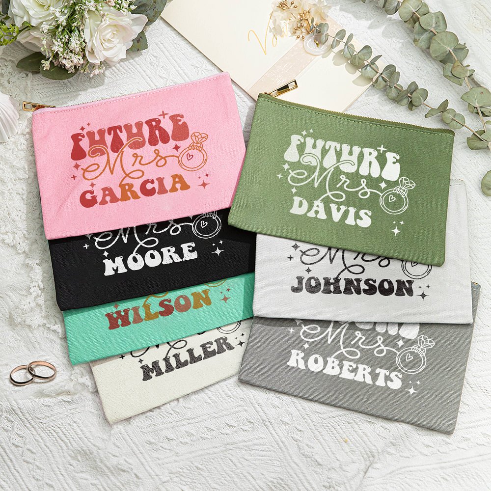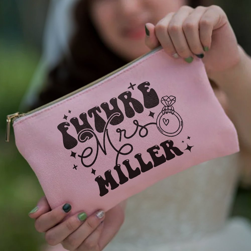 Diese Schminktasche ist eine reizvolle Mischung aus Retro-Charme und moderner Eleganz, perfekt für die zukünftige Braut! Das kühne, auffällige Design mit dem verspielten Schriftzug "Future Mrs.", umgeben von skurrilen Sternen und einem funkelnden Ring, macht sie zu einem echten Unikat.