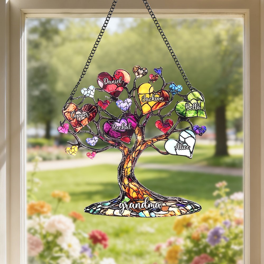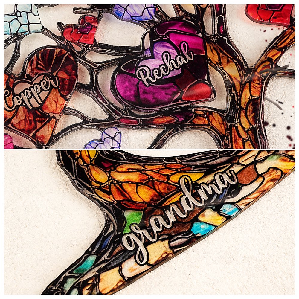 Diese Herzbaumdekoration besteht aus einer Acrylbasis mit einem strukturierten Baumstamm und Ästen, die bunte Herzakzente tragen. Jedes Herz ist mit einem Familiennamen bedruckt, und der Boden zeigt einen individuellen Text. Das Design verbindet zarte Ästhetik mit persönlichen Familiendetails und schafft so ein dekoratives Stück, das sowohl schön als auch voller Gefühlswärme ist.