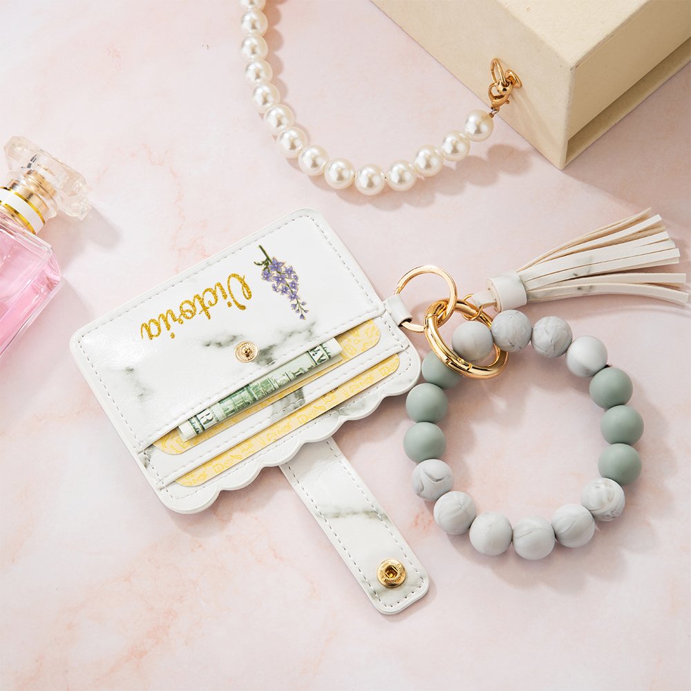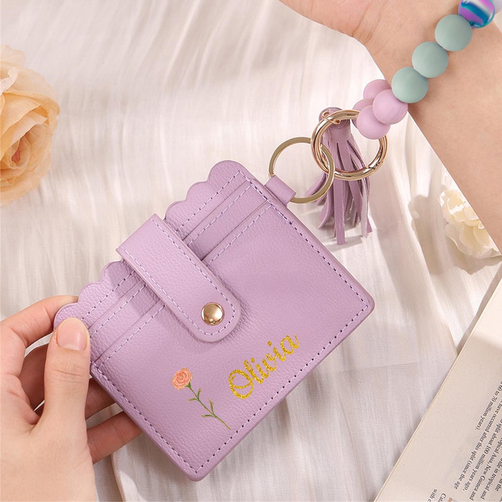 Diese Schlüsselanhänger-Brieftasche verfügt über eine einzigartige, goldumrandete Geburtsblume, die du entsprechend deinem Geburtsmonat auswählen kannst. Sie können auch Ihren Namen in faux Gold Glitter Stil anpassen, um die Brieftasche noch einzigartiger zu machen. Das Portemonnaie kommt auch mit einem speziellen Perlenarmband, um es noch spezieller zu machen.