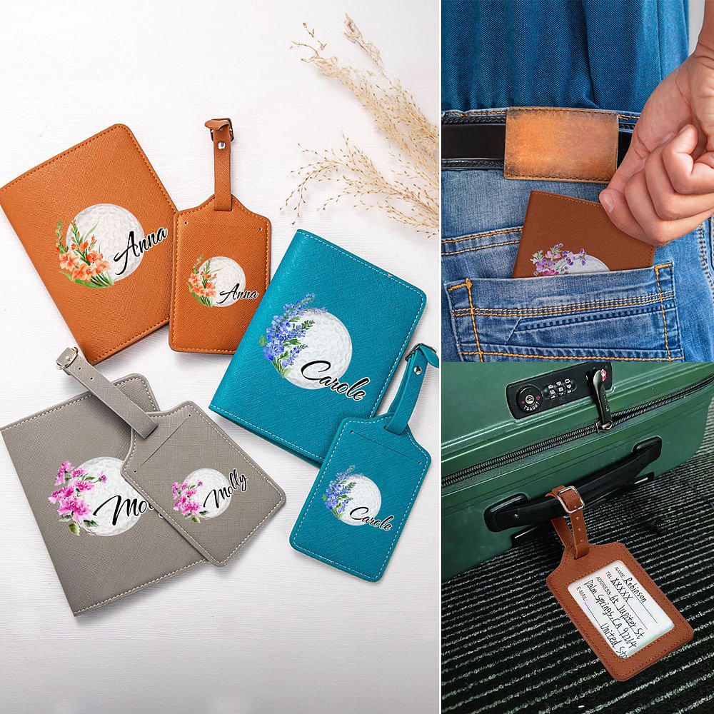 The passport holder features multiple slots to accommodate your passport, cards, and other essential documents, ensuring everything is easily accessible. The luggage tag, adorned with your personalized message, adds a touch of personalization and helps you quickly identify your bags, making the hassle of navigating busy airports a breeze.