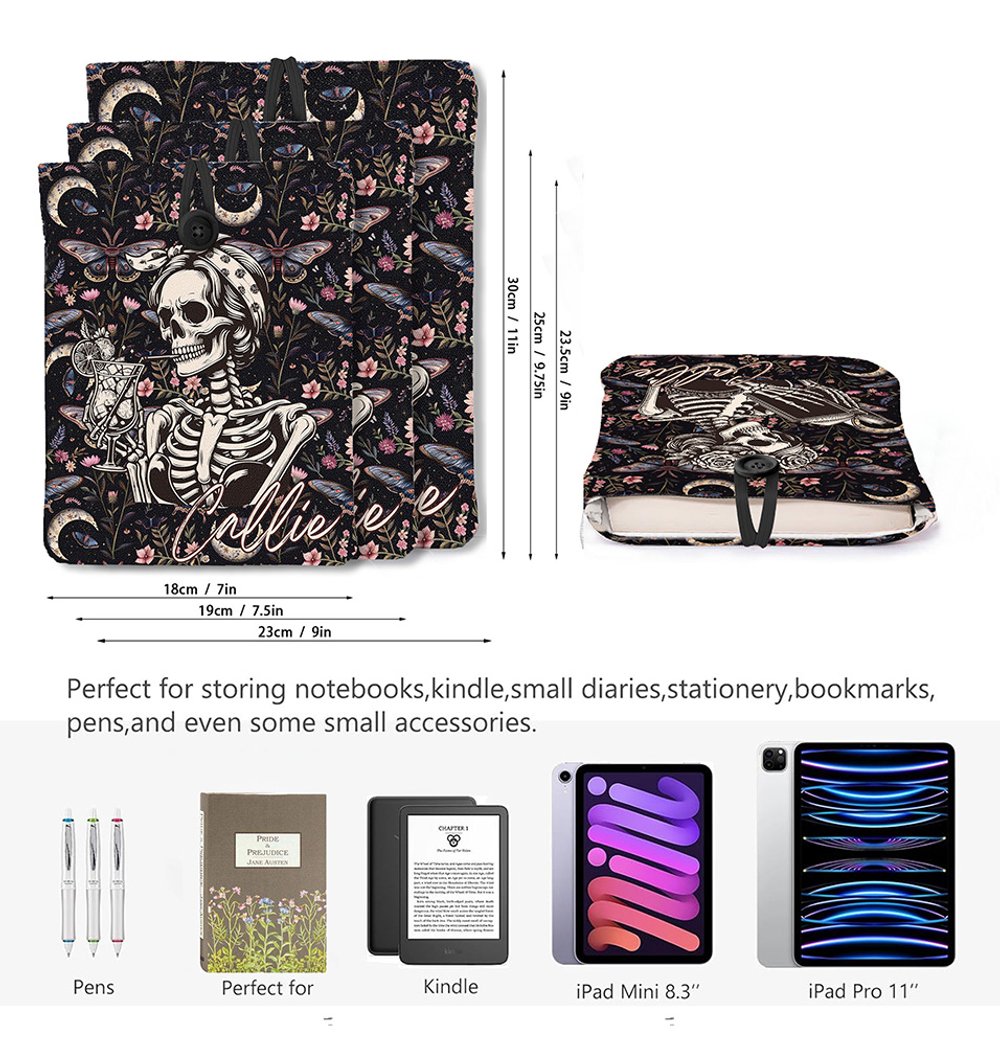 Diese Buchhülle hat ein auffälliges Gothic-Design mit einem einzigartigen Skelett- und Blumenmuster, das sie zu einem auffälligen Accessoire macht. Personalisieren Sie sie mit einem individuellen Namen für eine besondere Note, perfekt für Buchliebhaber, die ein gruseliges Flair mögen.