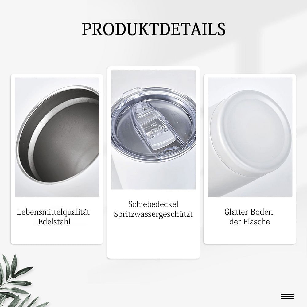 Hergestellt aus lebensmittelechtem Edelstahl, hält diese Flasche Getränke über längere Zeit heiß oder kalt. Der BPA-freie Deckel sorgt für einen sicheren Verschluss und verfügt über einen auslaufsicheren Schieber. Darüber hinaus bietet die Flasche eine hervorragende Isolierung, die Ihre Getränke stundenlang warm oder kalt hält – perfekt für unterwegs.