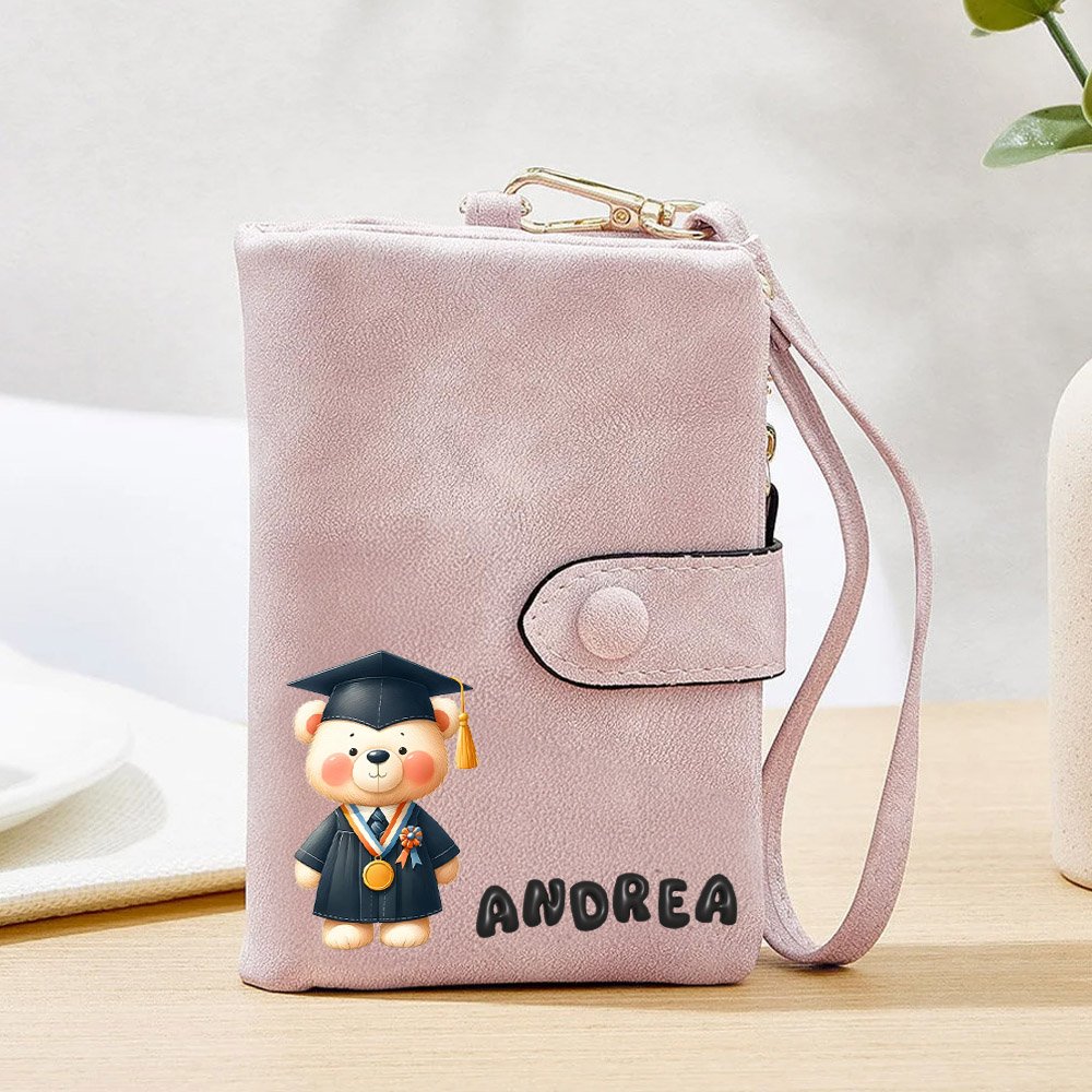 Es ist mit einem exquisiten Cartoon-Bären in akademischen Ornaten verziert, der diesem Lederportemonnaie eine warme und fröhliche Schönheit verleiht. Wir bieten bis zu 16 bezaubernde Posen von Abschlussbären, so dass Sie je nach Vorliebe wählen können. Die individuelle 3D-Blase Name fügt eine niedliche Note zu dieser Brieftasche.