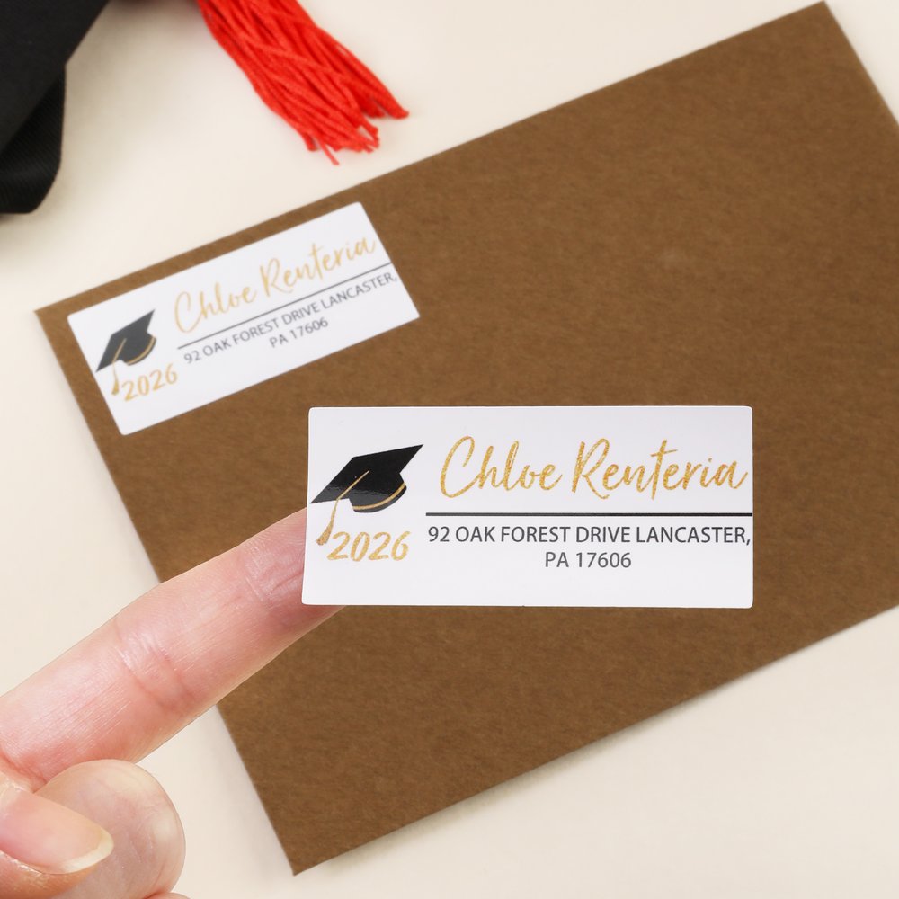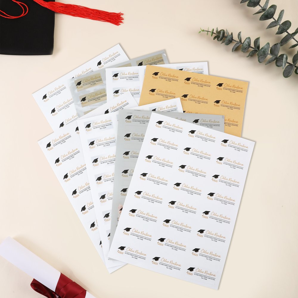 Ideal für Rücksendeadressen auf Einladungen zum Schulabschluss, Danksagungskarten, Fotosendungen, Geschenkverpackungen und Korrespondenz mit Ehemaligen. Ganzbogen-Layouts ermöglichen ein schnelles Ablösen von Großmengen für Klassen- oder Schulbestellungen, während sich kleinere Mengen für die individuelle Gestaltung eignen. Sie eignen sich auch gut für Sammelalben, Erinnerungsboxen und Geschenke für Abschlussfeiern - sie vereinfachen den Versand und werten die Präsentation auf.