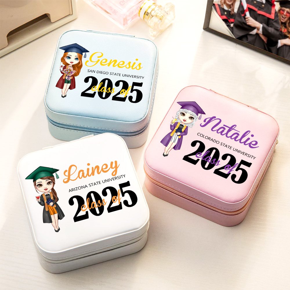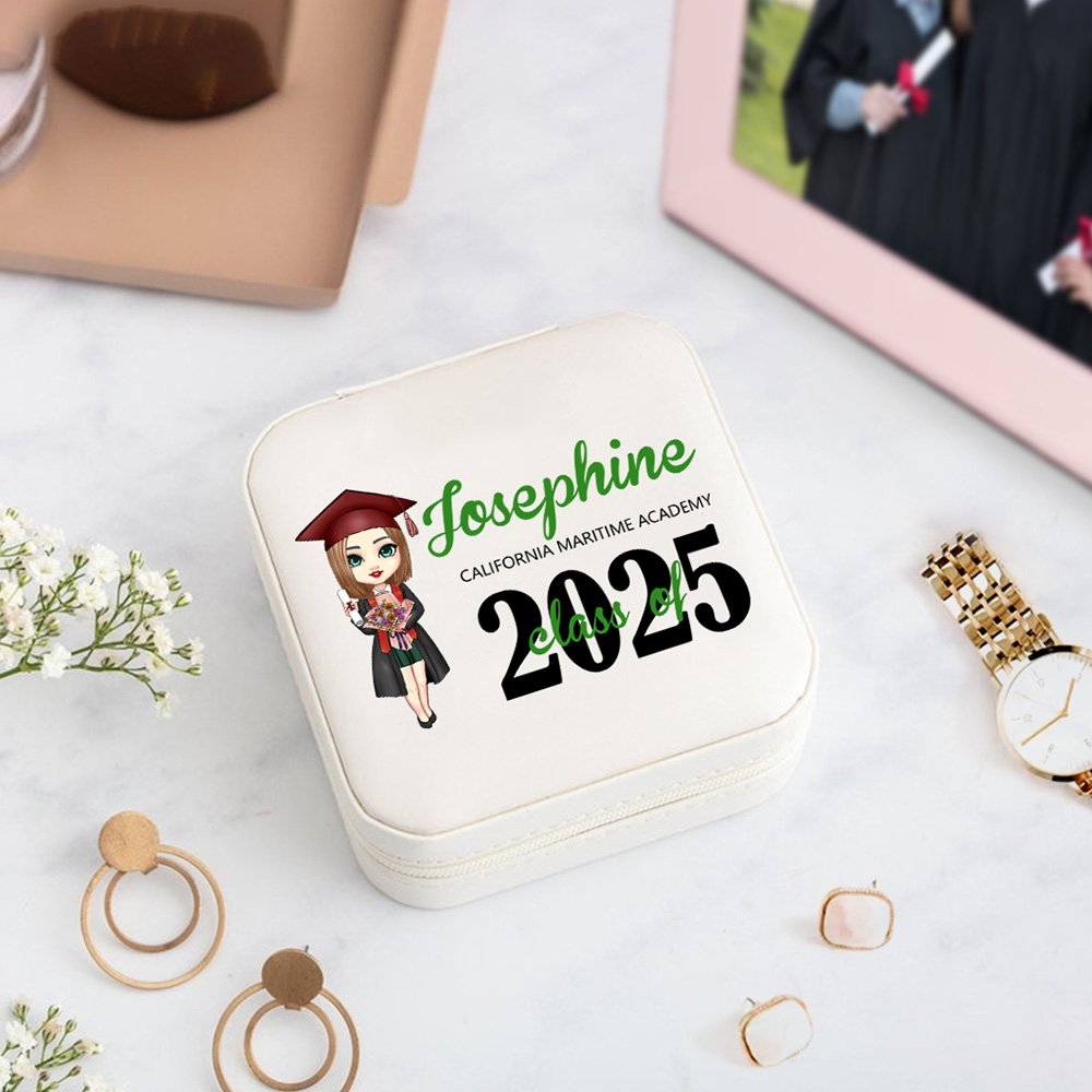 Diese Schmuckschatulle besticht durch ihr Cartoon-Bild im Graduierungskleid. Das Design ist frisch und niedlich, voll von Jugend und Vitalität. Gleichzeitig können Sie Ihren Namen, die Schule und das Abschlussjahr aufdrucken, um dem Schmuckkästchen eine einzigartige Bedeutung zu verleihen. Ob als Andenken an die Abschlussfeier oder als besonderes Geschenk für Verwandte und Freunde, der Empfänger wird sich überrascht und umsorgt fühlen.