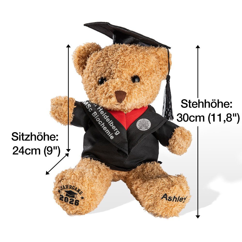 Dieser Teddybär ist das perfekte Geschenk zum Abschluss eines Kindergarten- oder Universitätsabsolventen. Er vereint Sentimentalität, Stil und Personalisierung in einem tollen Paket. Wenn der Absolvent diesen Teddybären erhält, wird sein Gesicht vor Freude erstrahlen. Er ist ein Geschenk, das er viele Jahre lang schätzen wird und ihn an seinen besonderen Abschluss-Tag sowie die Liebe und Unterstützung von Familie und Freunden erinnert.